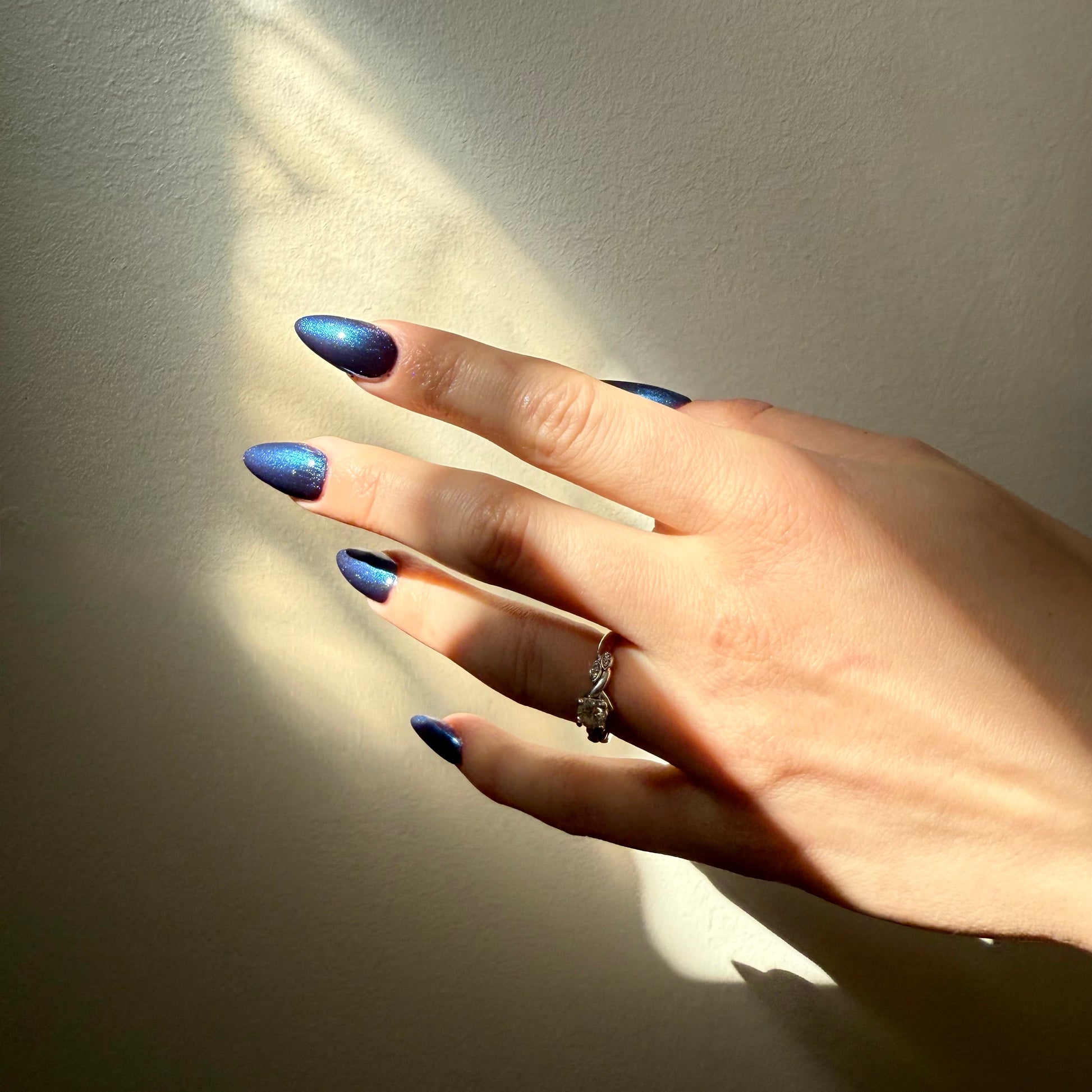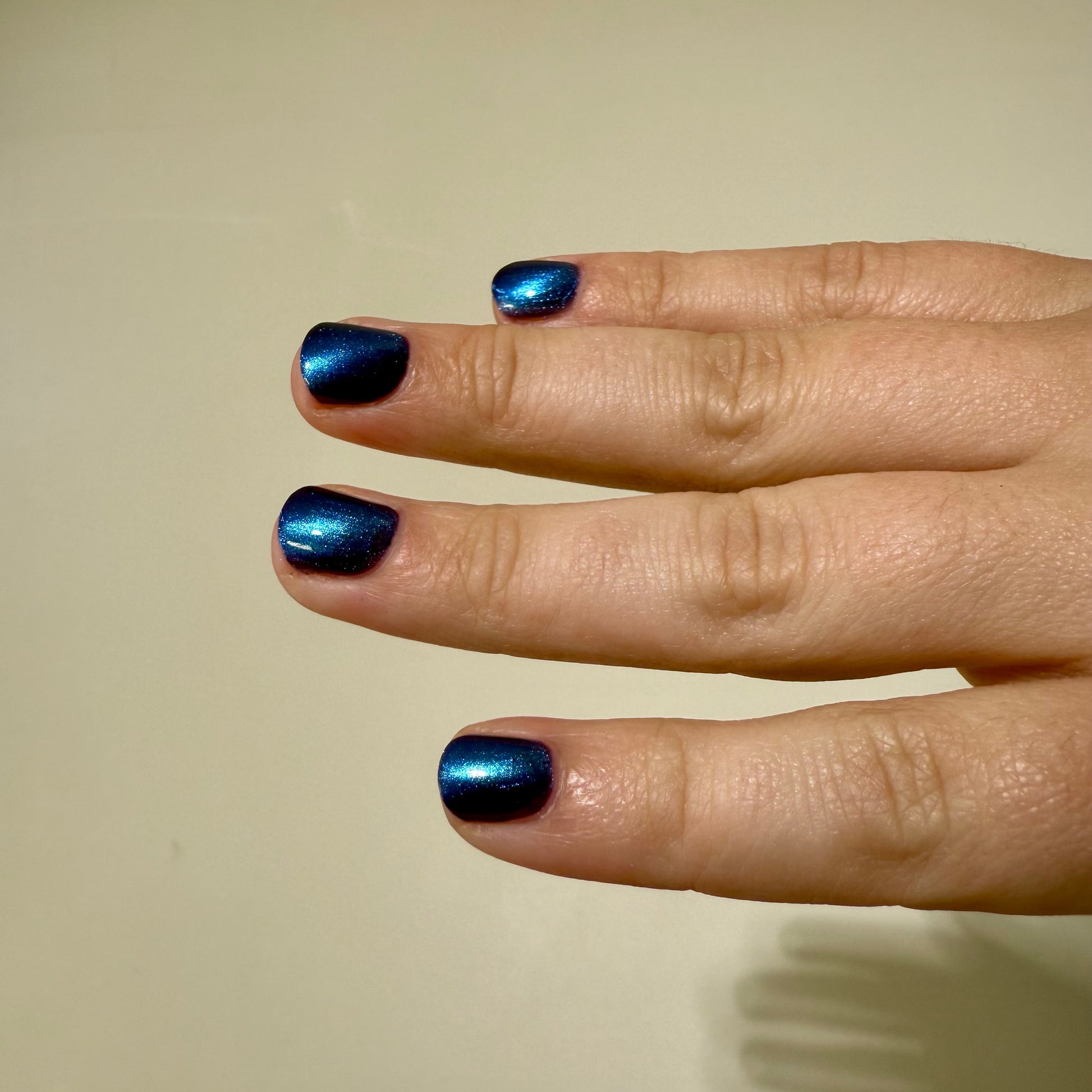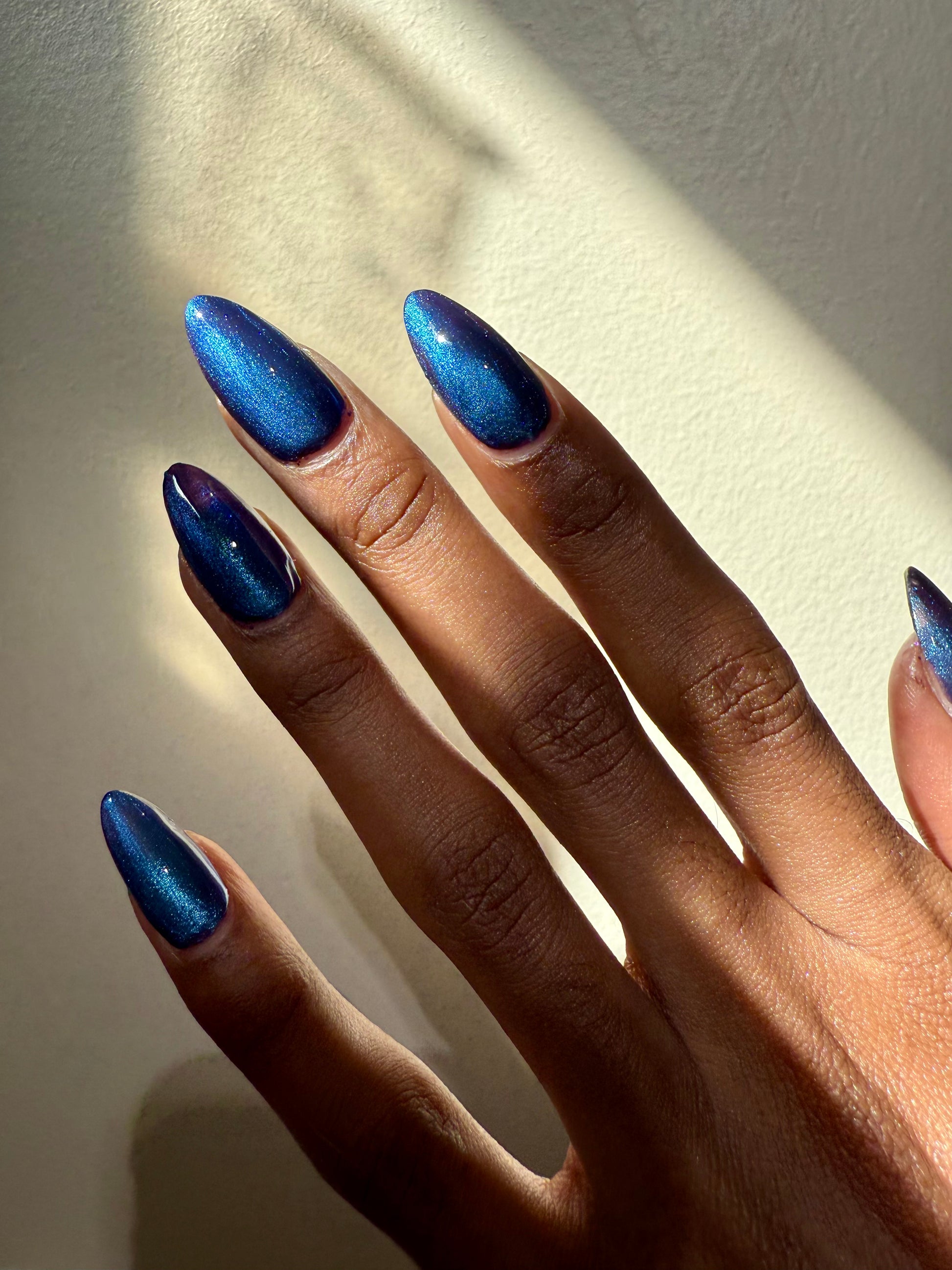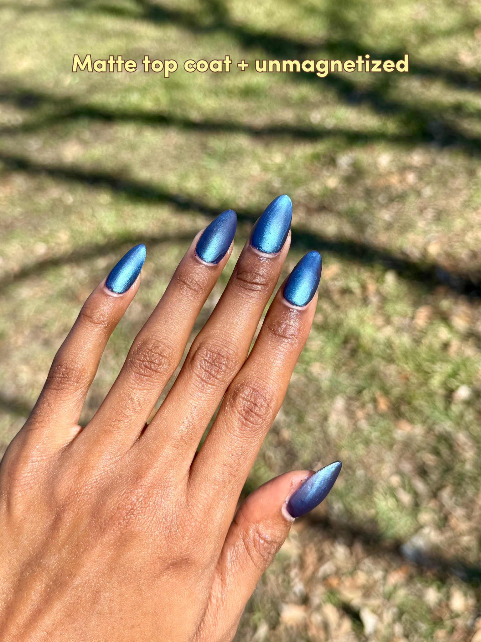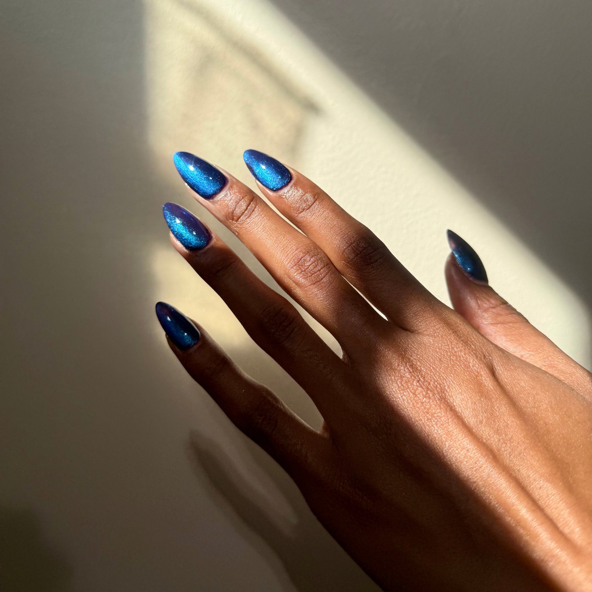 Cool toned plum-brown base with bright steel-blue magnetic pigment. Moonlight cast over tilled soil. Moody and ethereal.