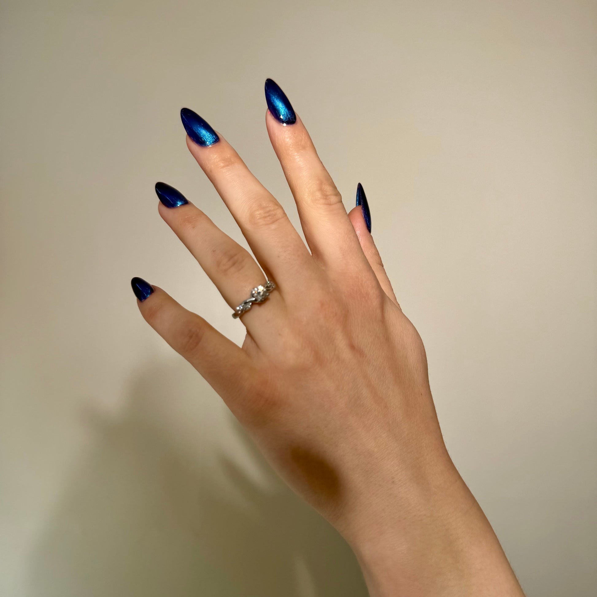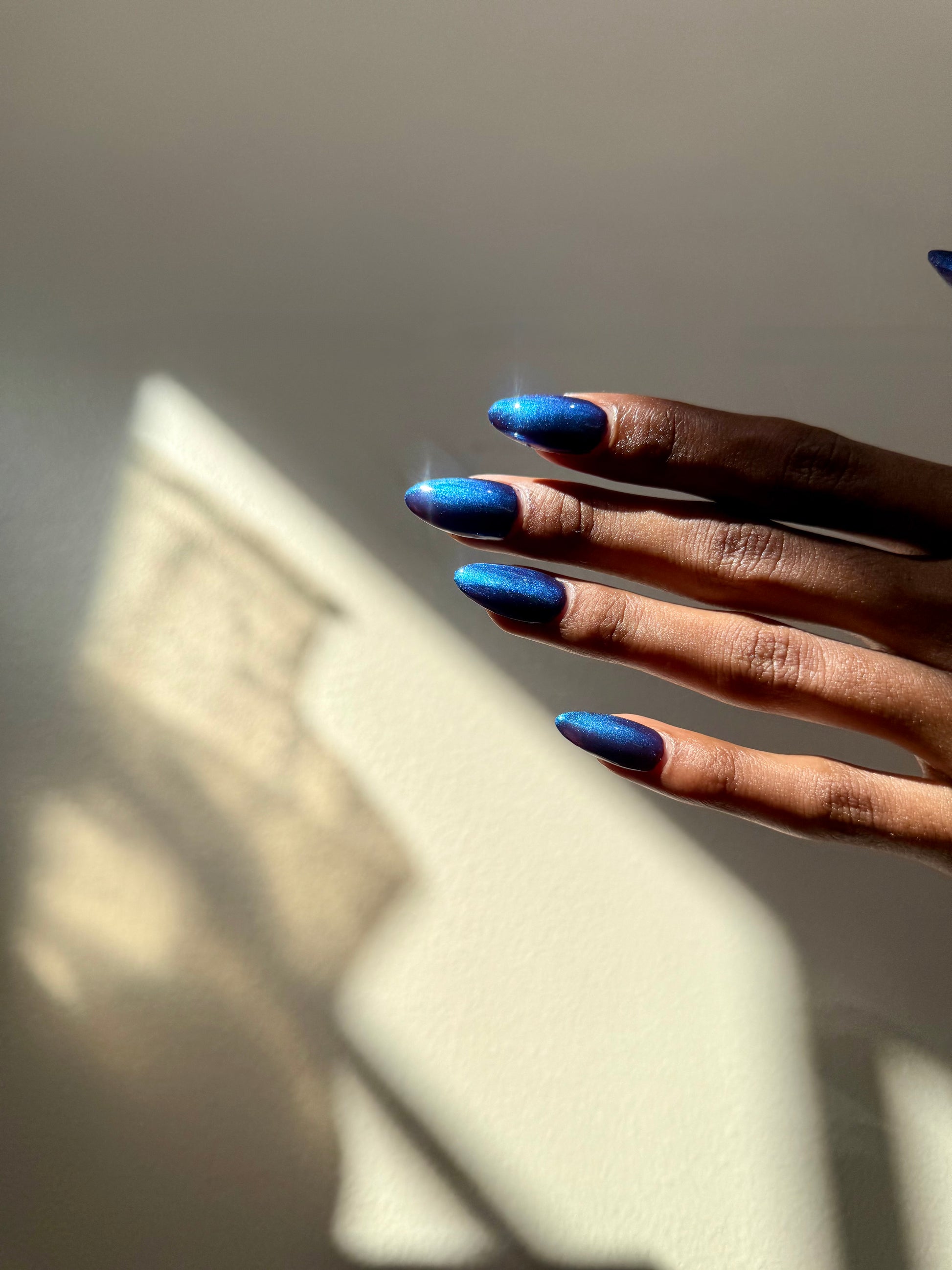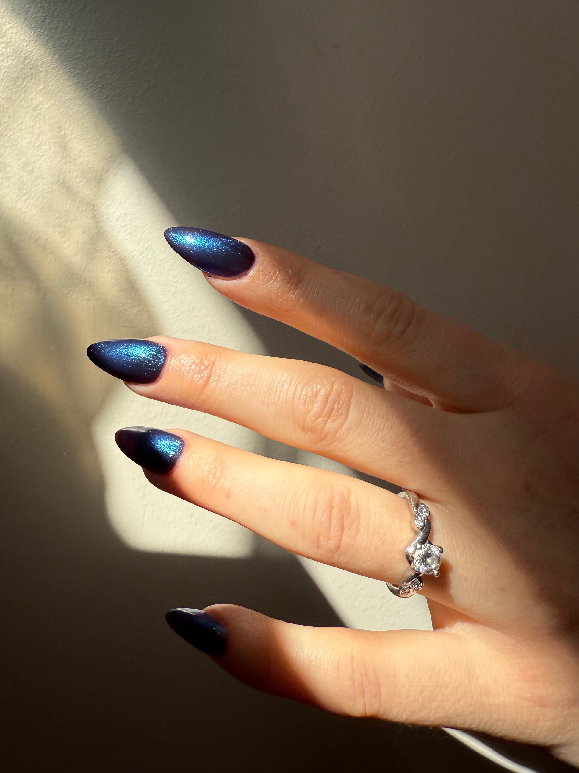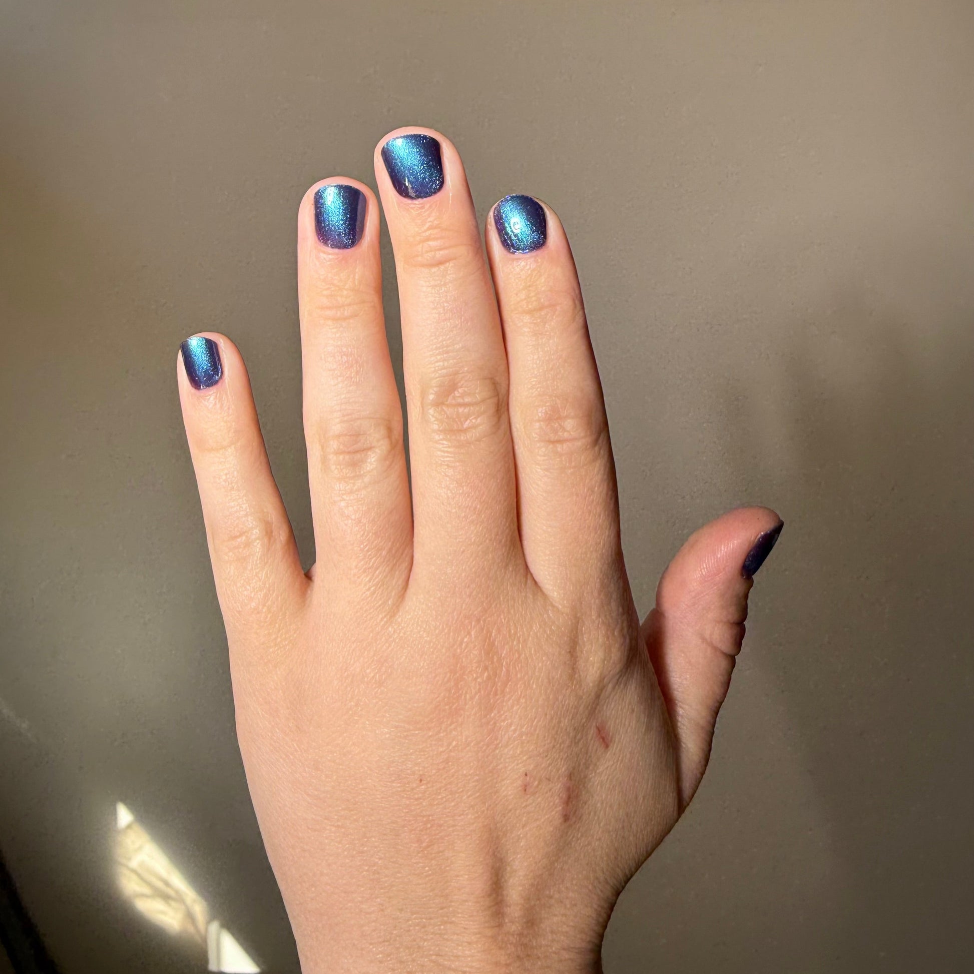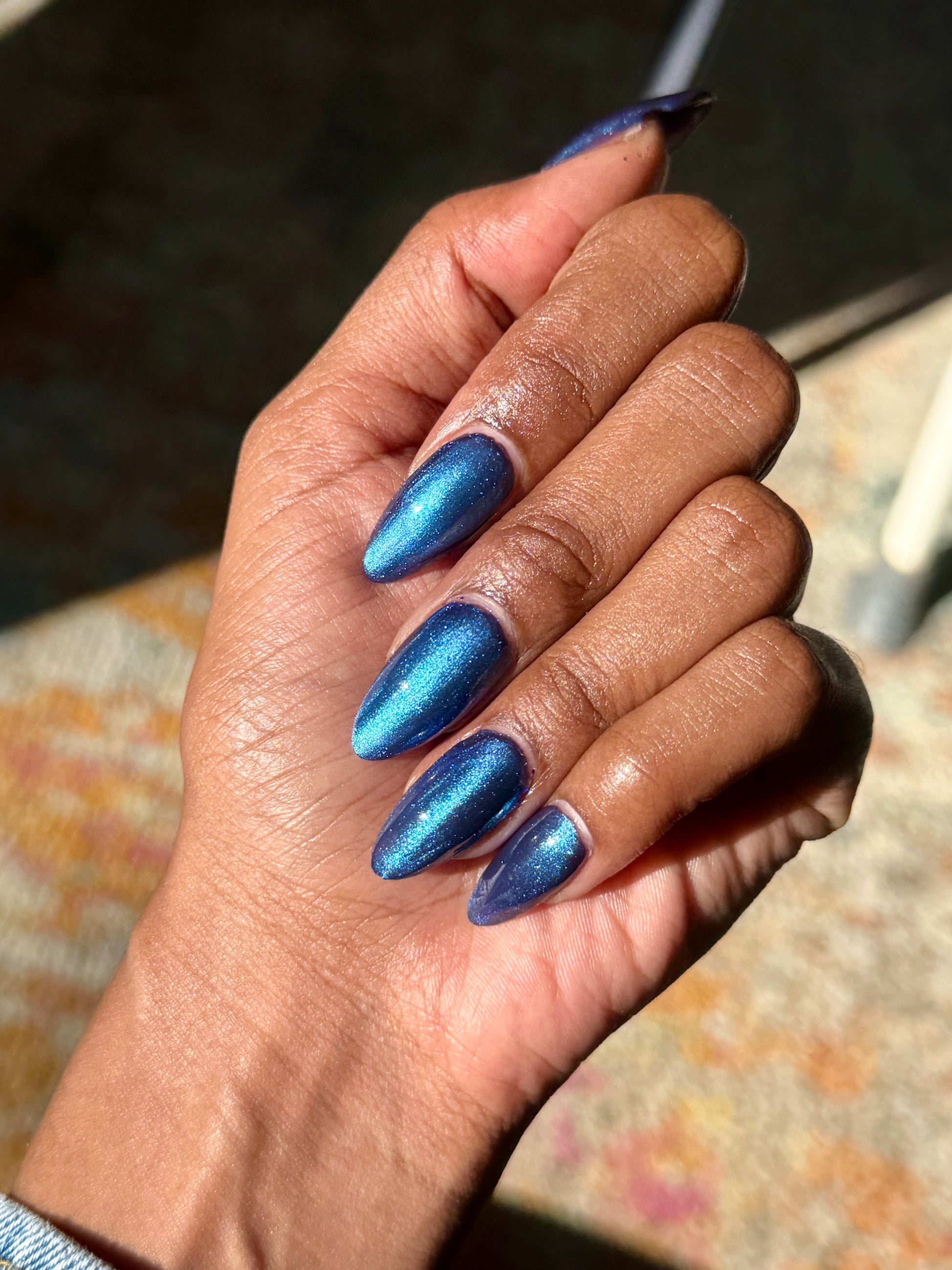 Cool toned plum-brown base with bright steel-blue magnetic pigment. Moonlight cast over tilled soil. Moody and ethereal.