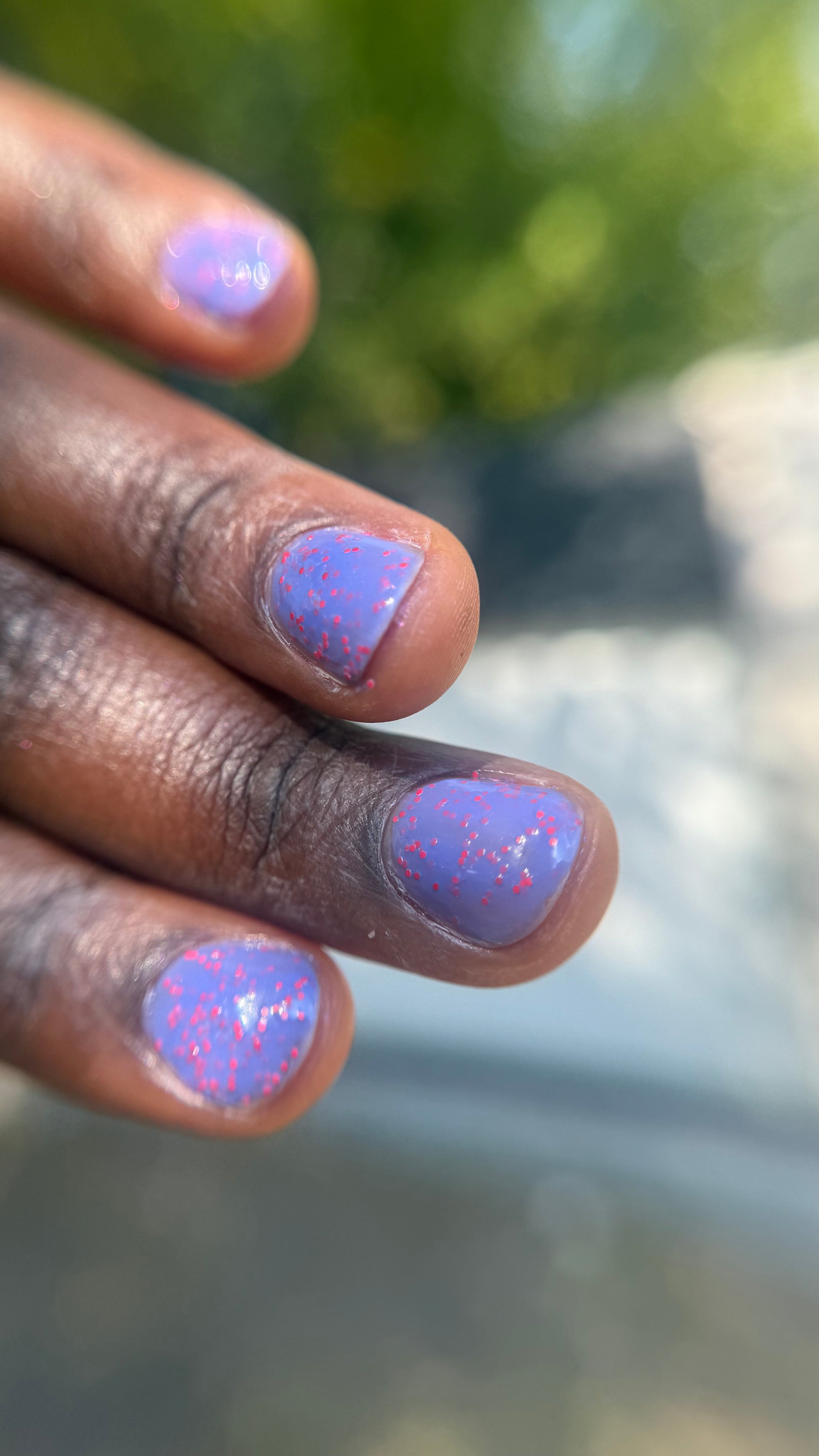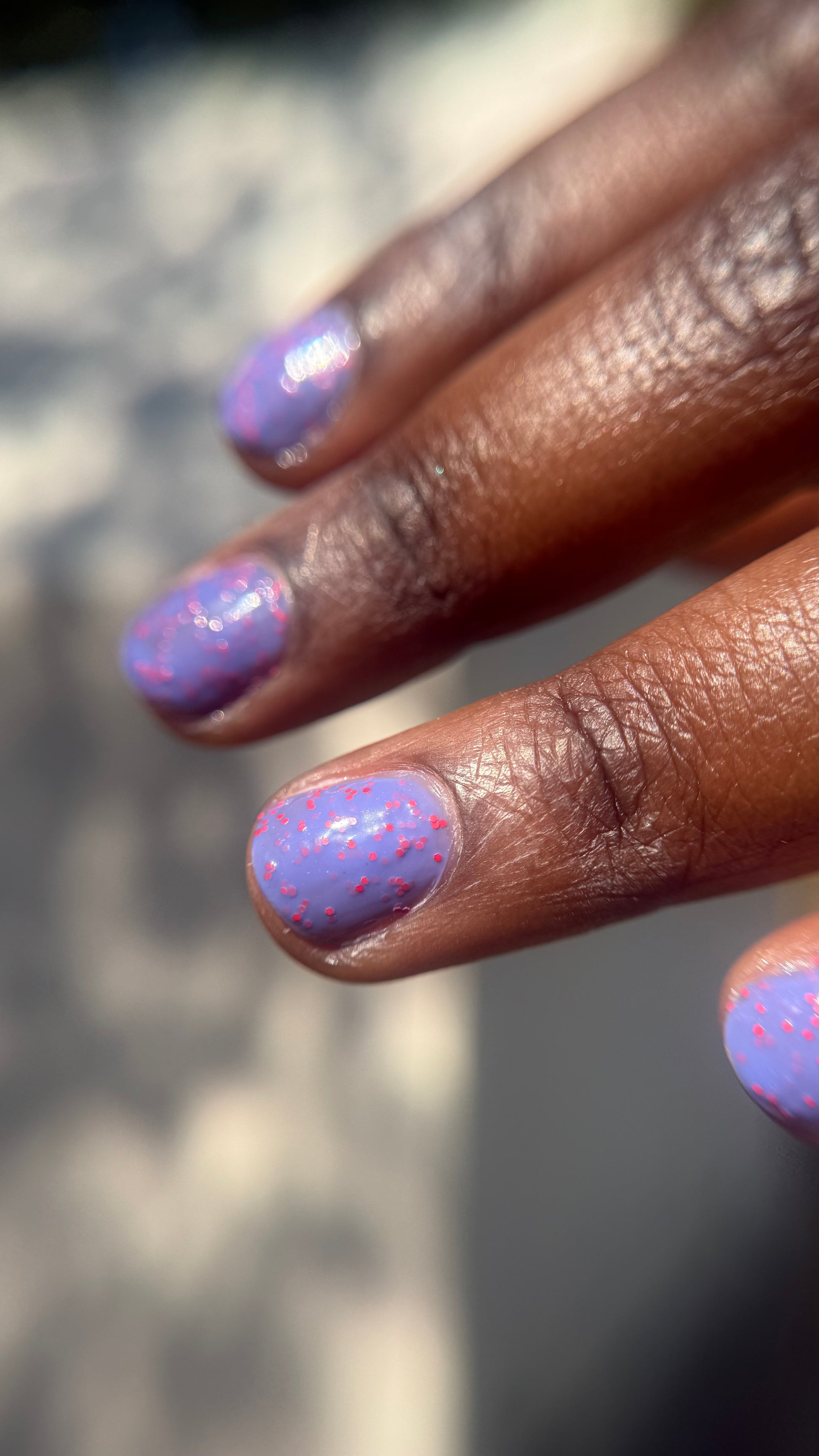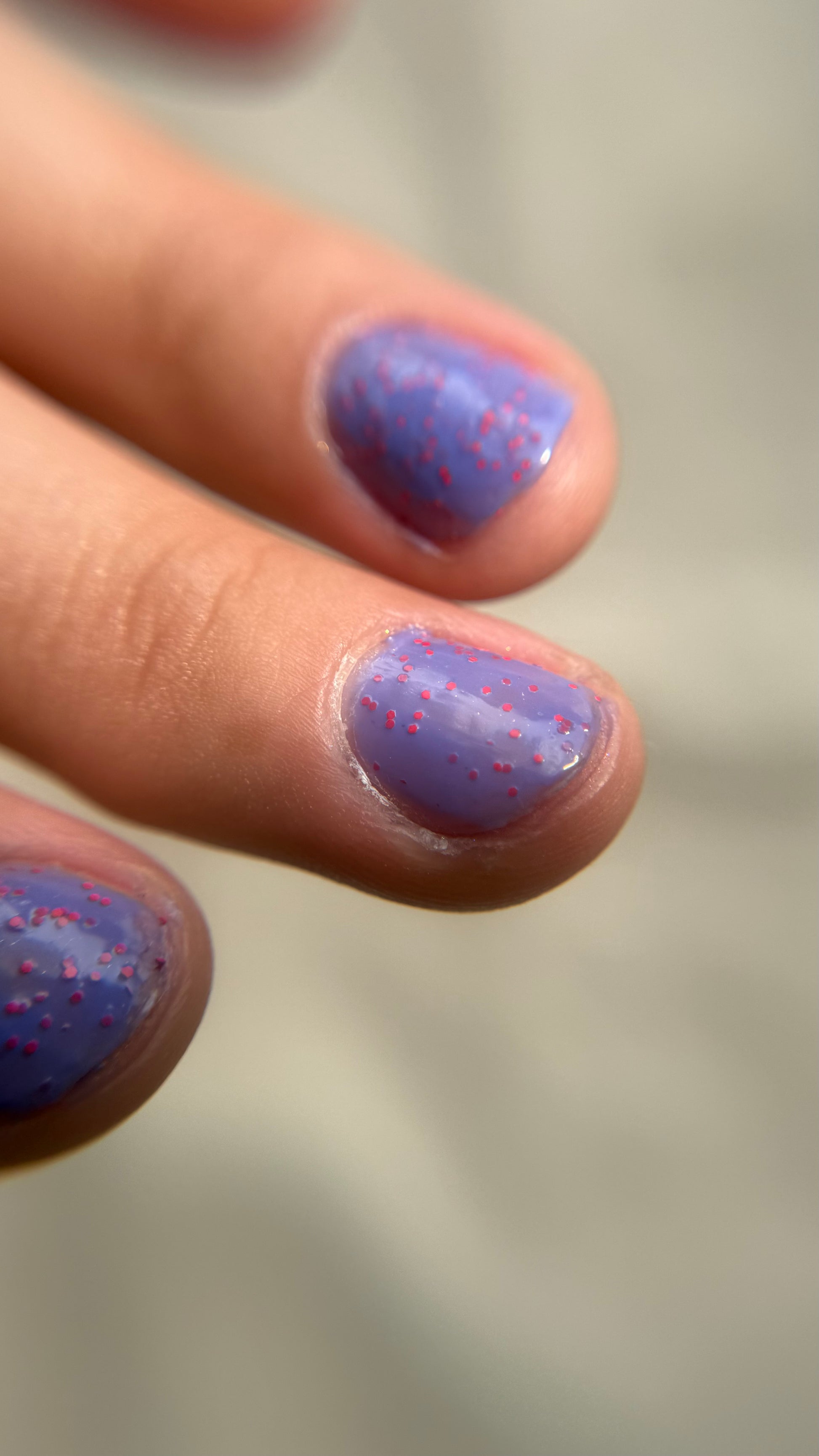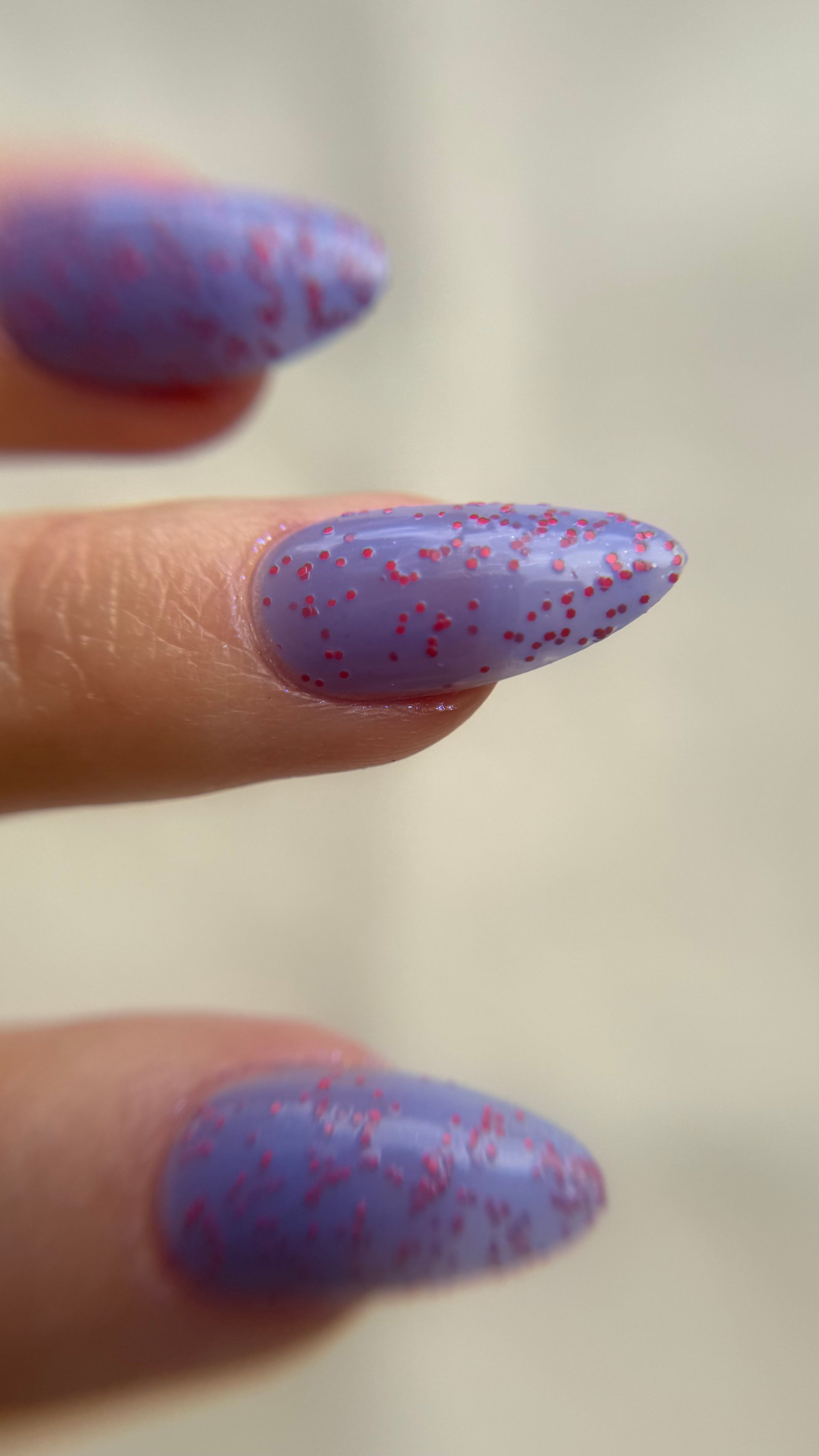 Milk periwinkle-lavender base that leans slightly blue in the shade and softens towards lilac in direct light. Freckled throughout the semi-sheer base are tiny neon-matte cherry glitters. Interesting, diseased, cute.