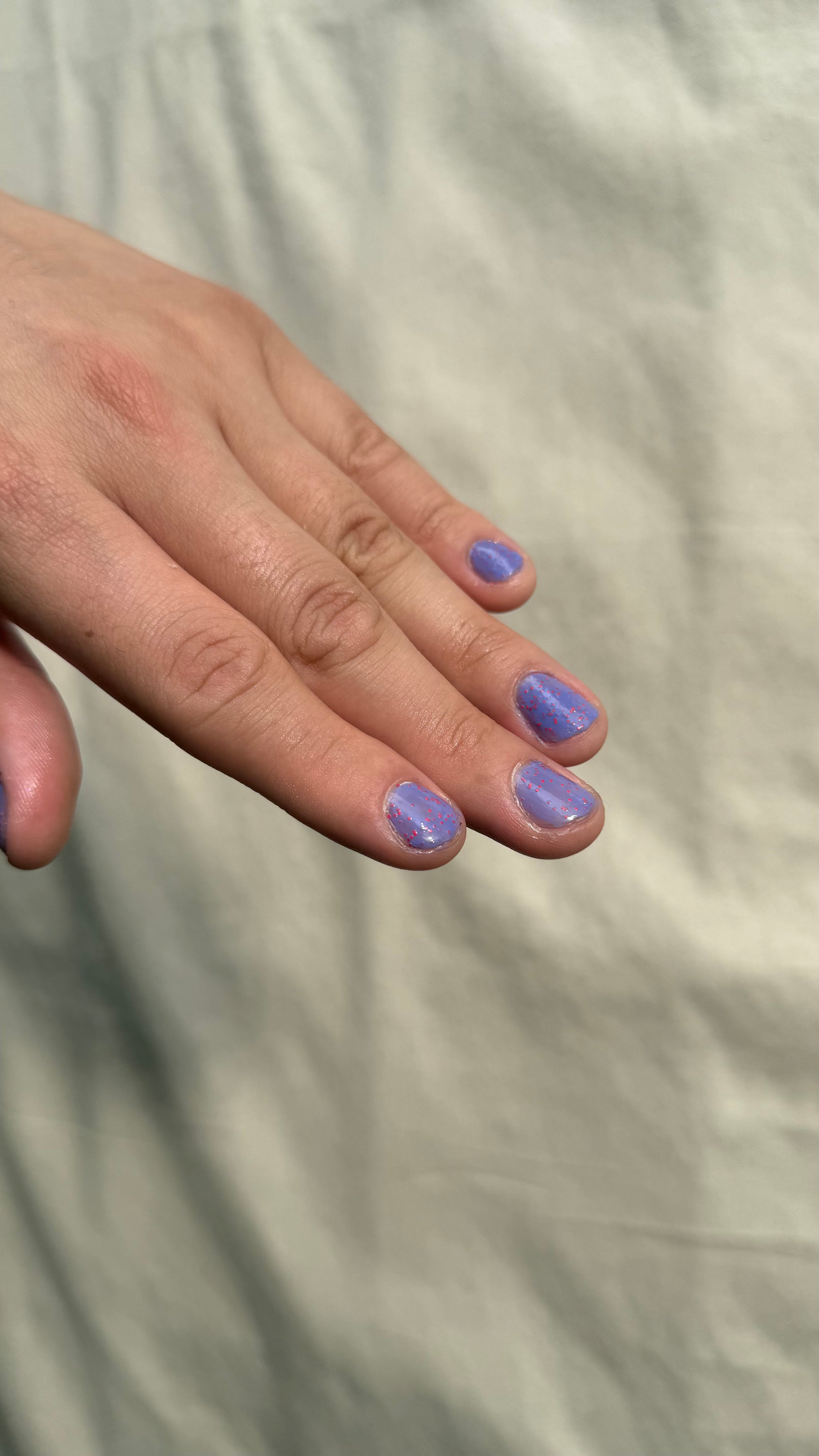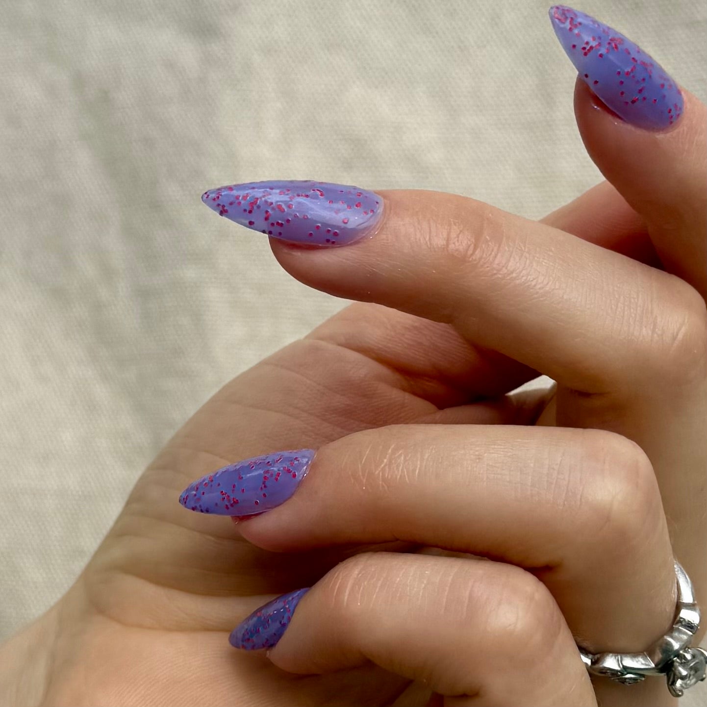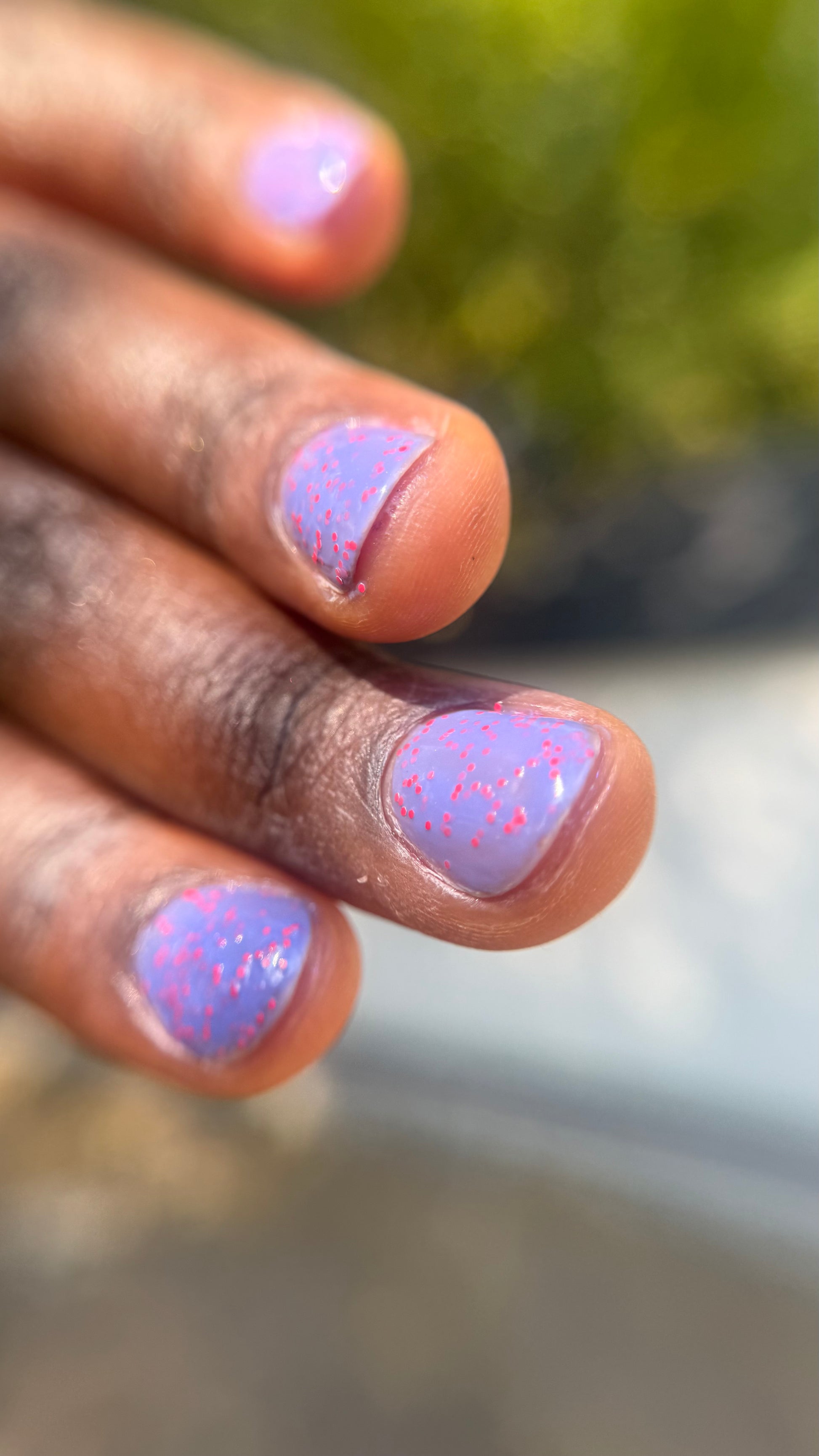 Milk periwinkle-lavender base that leans slightly blue in the shade and softens towards lilac in direct light. Freckled throughout the semi-sheer base are tiny neon-matte cherry glitters. Interesting, diseased, cute.