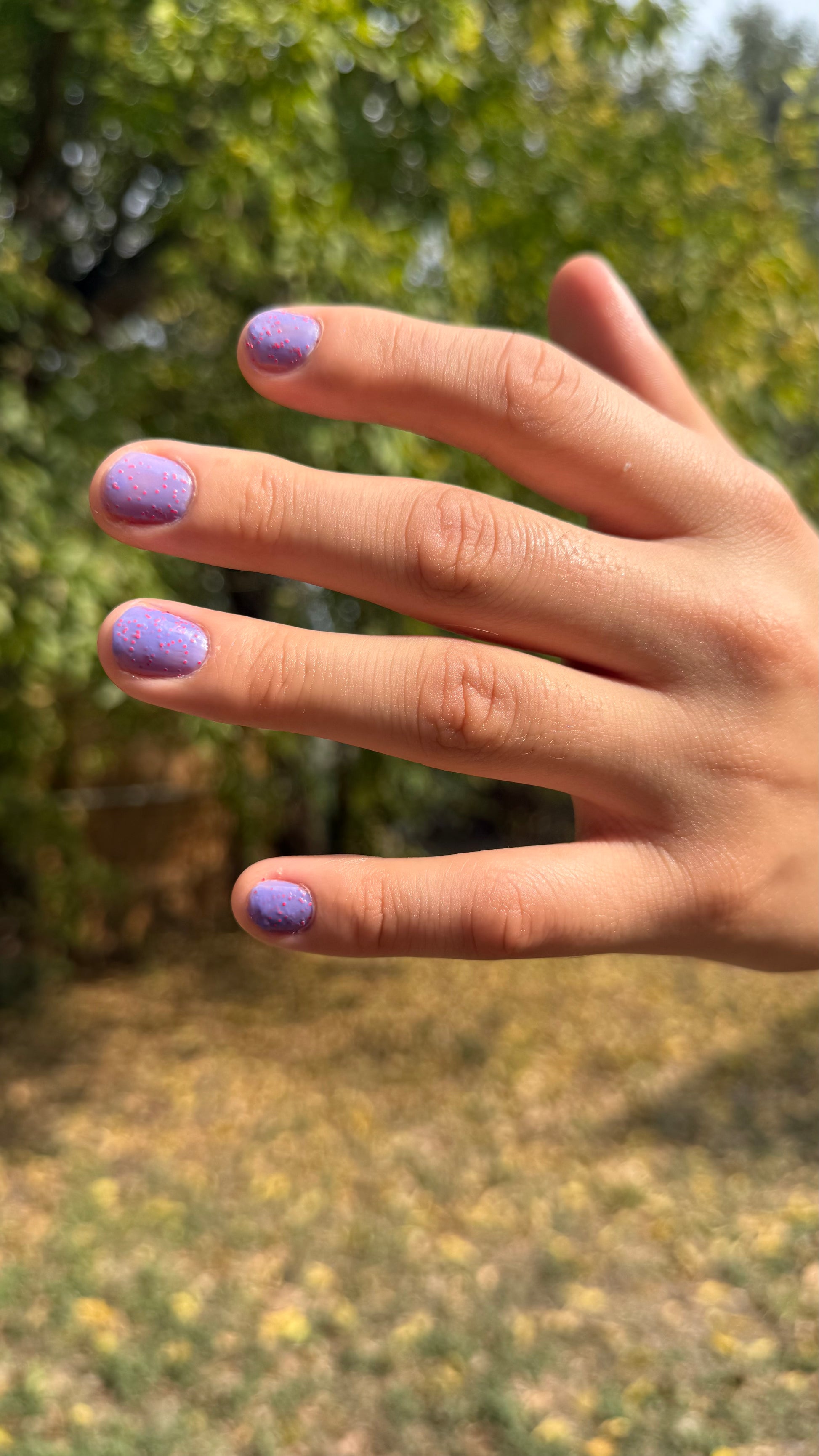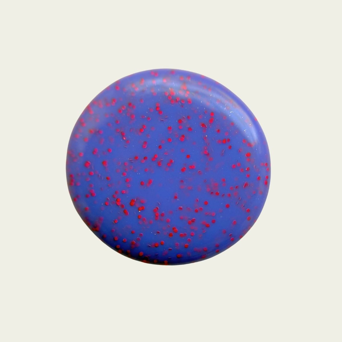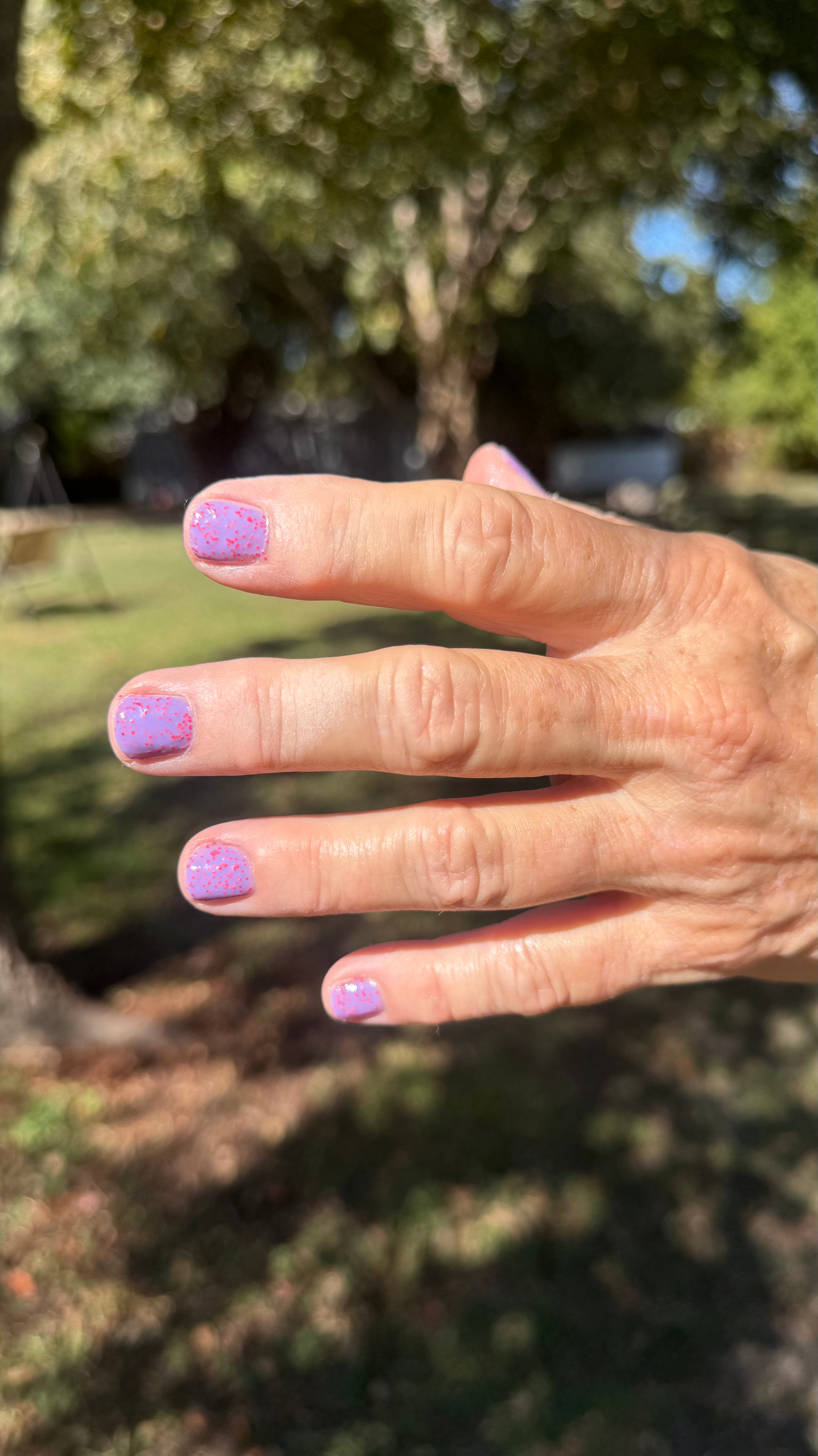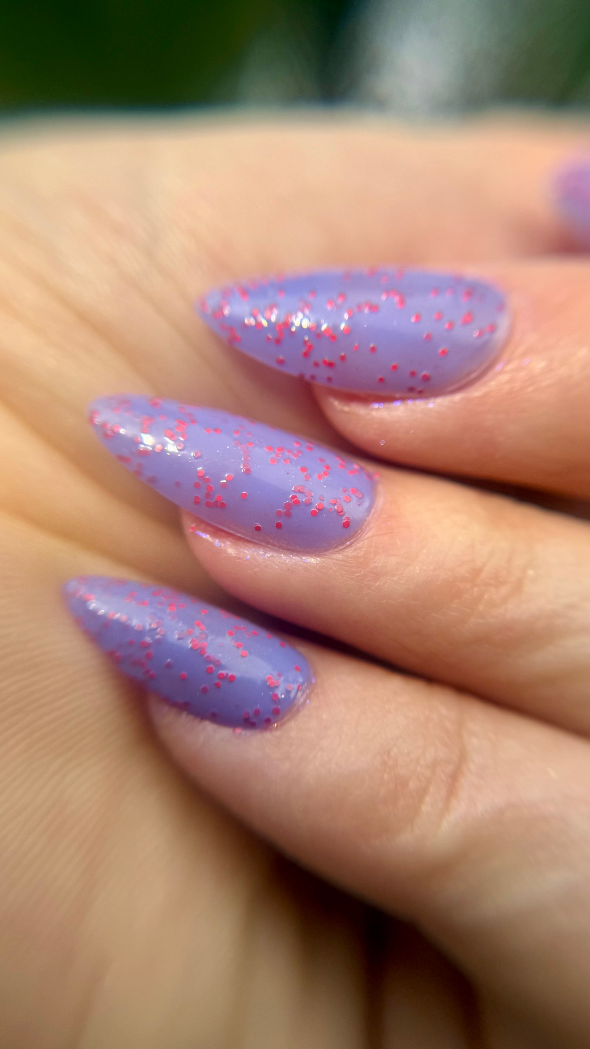 Milk periwinkle-lavender base that leans slightly blue in the shade and softens towards lilac in direct light. Freckled throughout the semi-sheer base are tiny neon-matte cherry glitters. Interesting, diseased, cute.