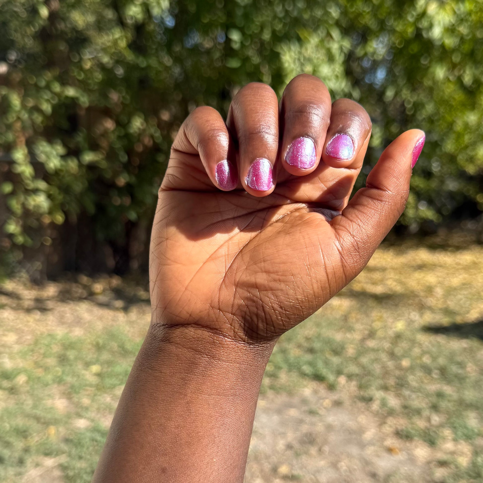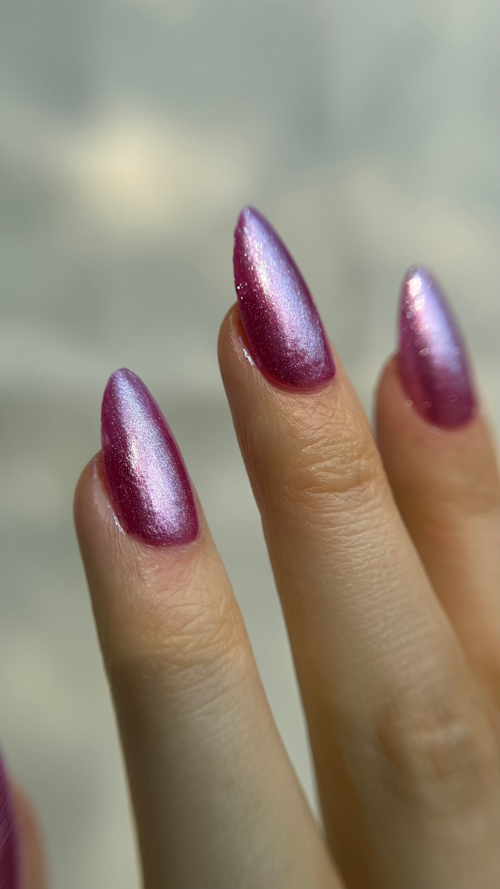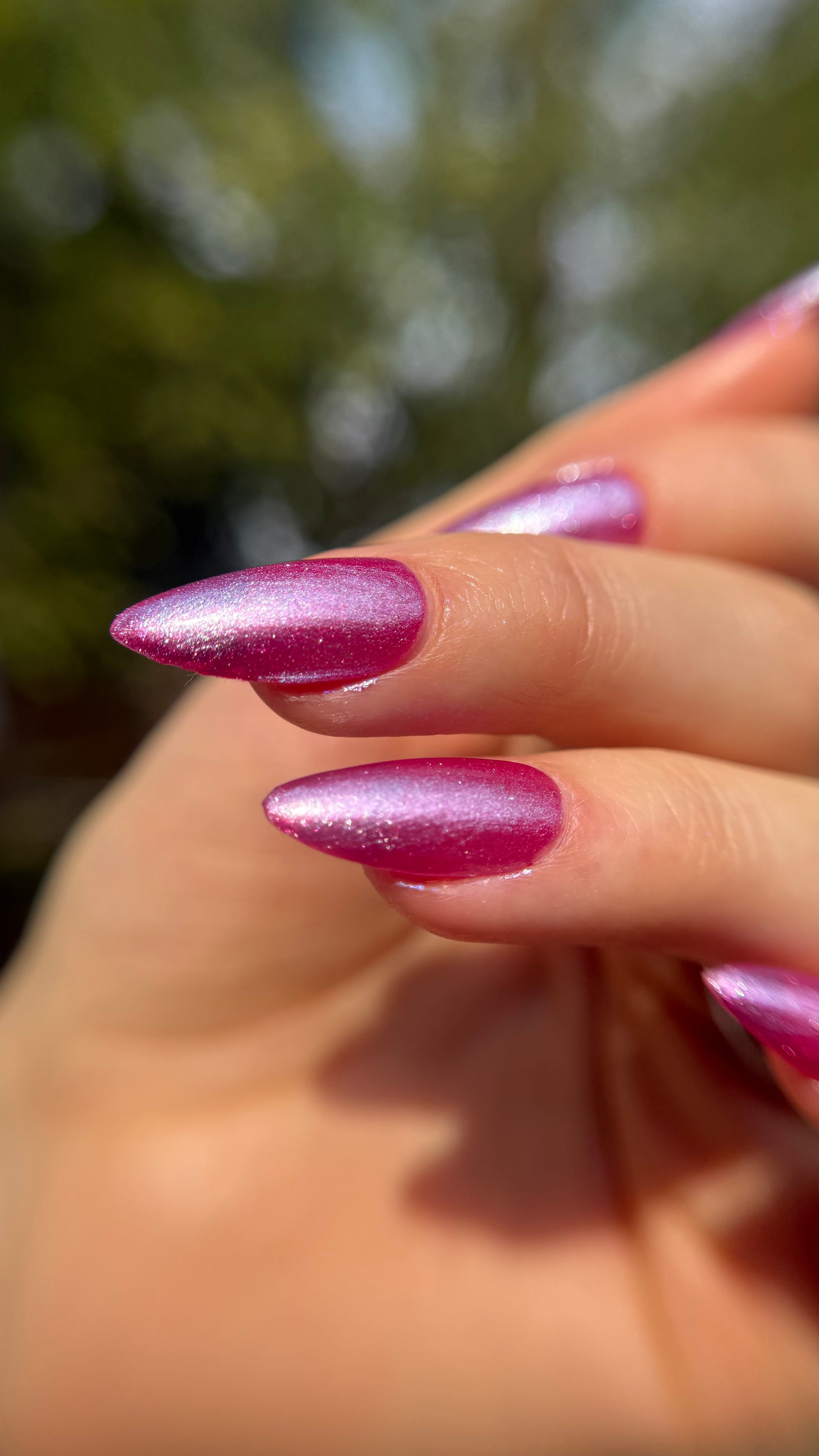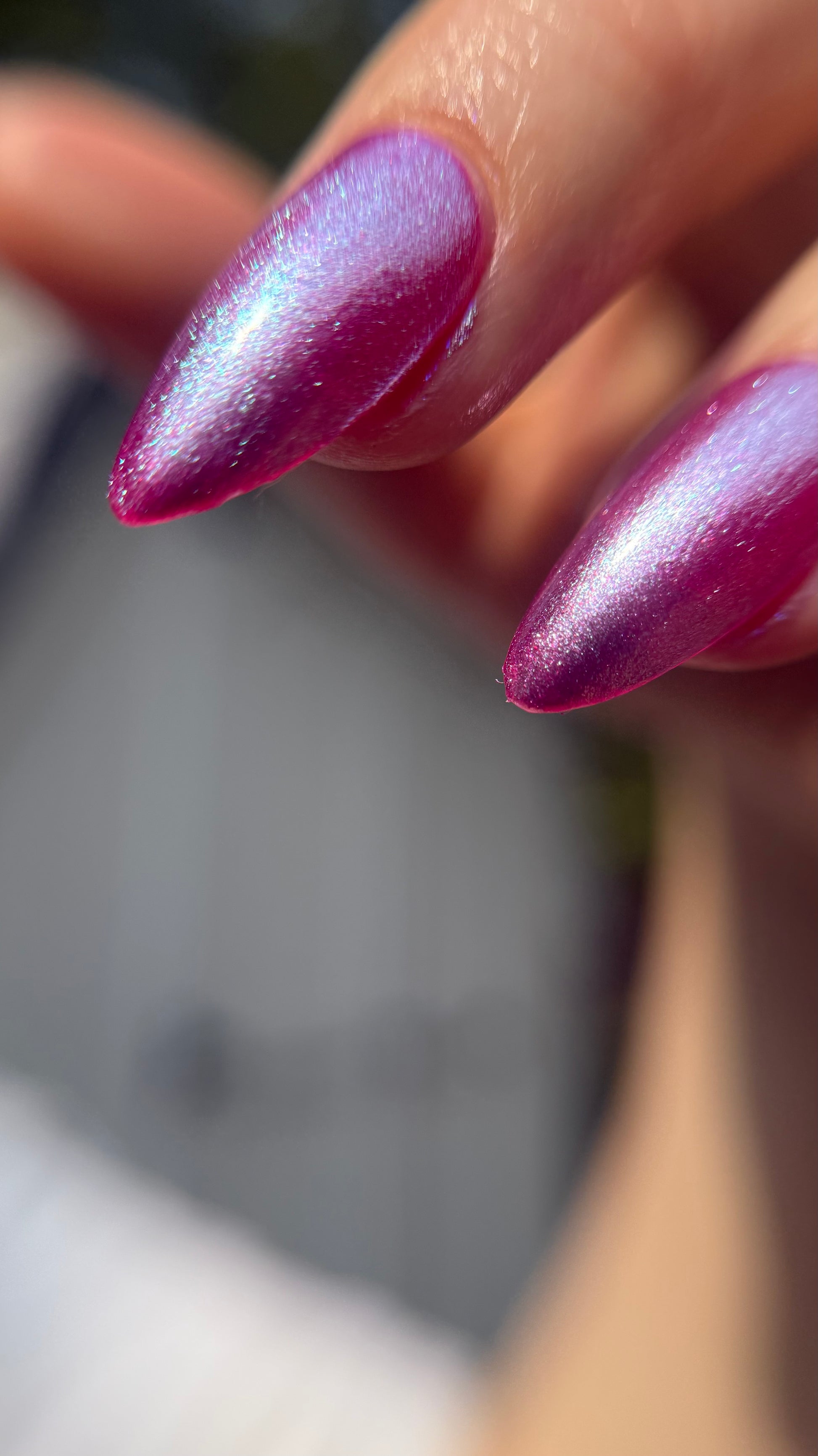 Jelly raspberry base with strong silver shimmer that shifts to blue/green at an angle. Easy application with a frosted, almost metallic finish.