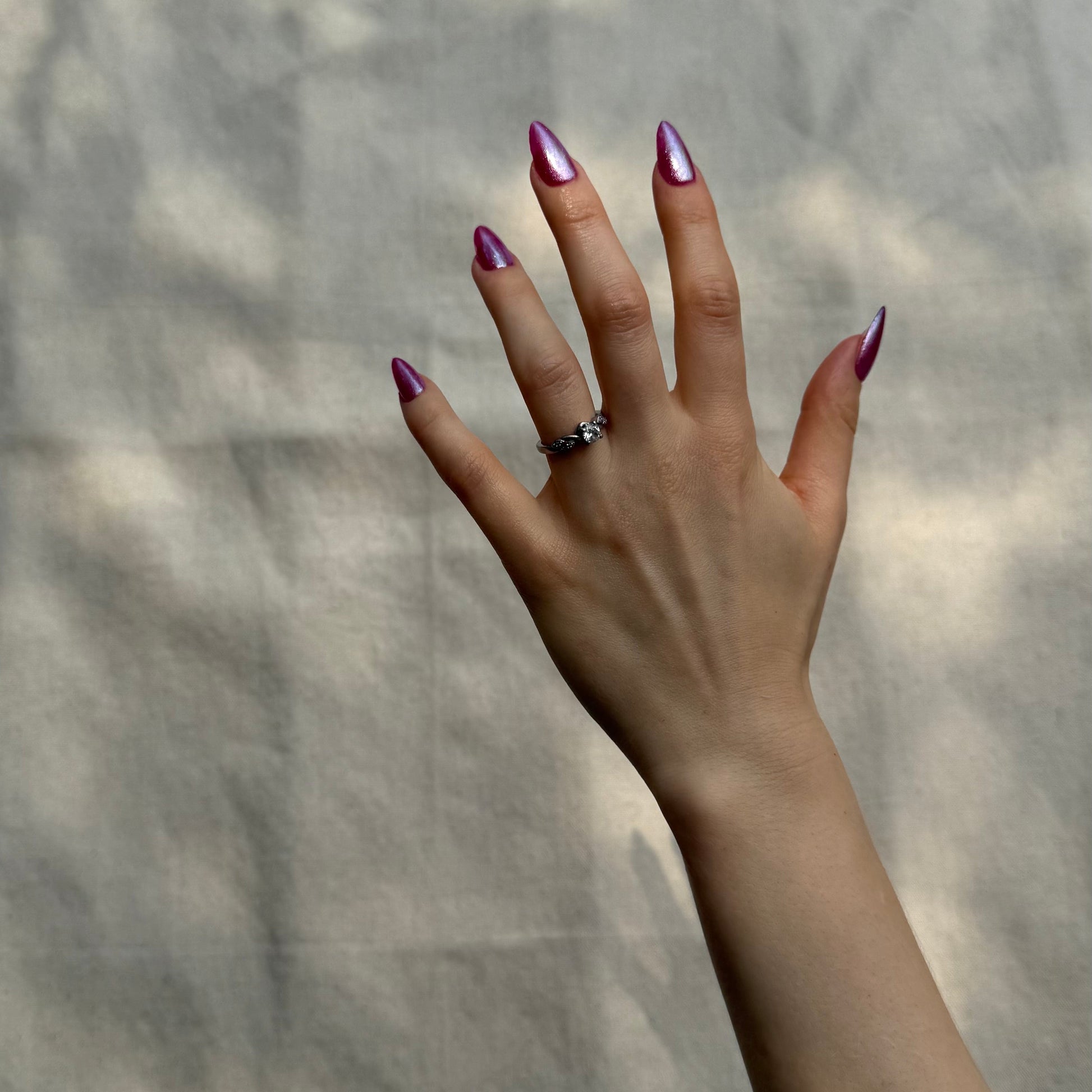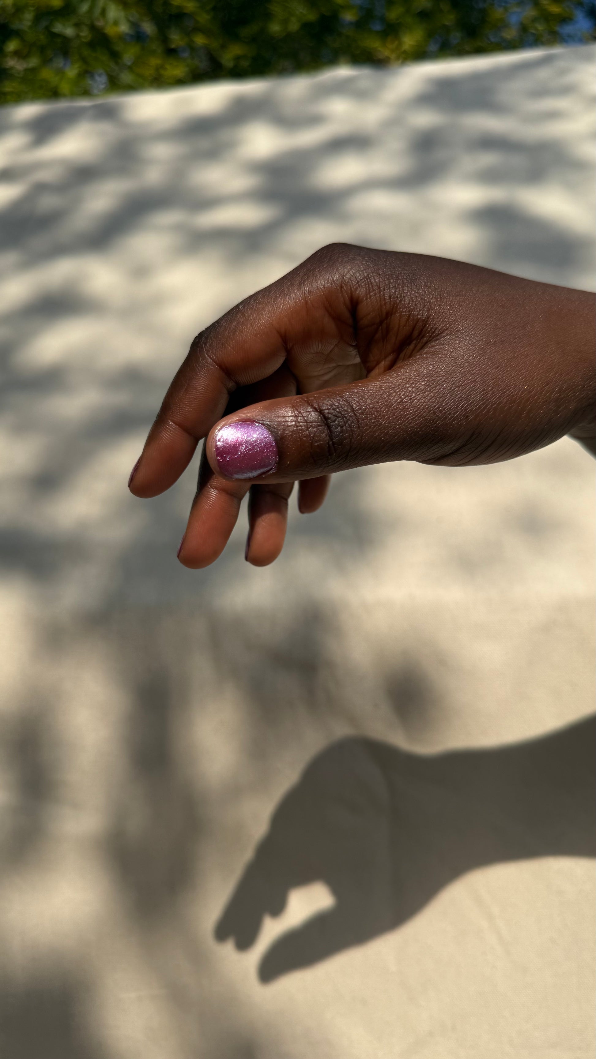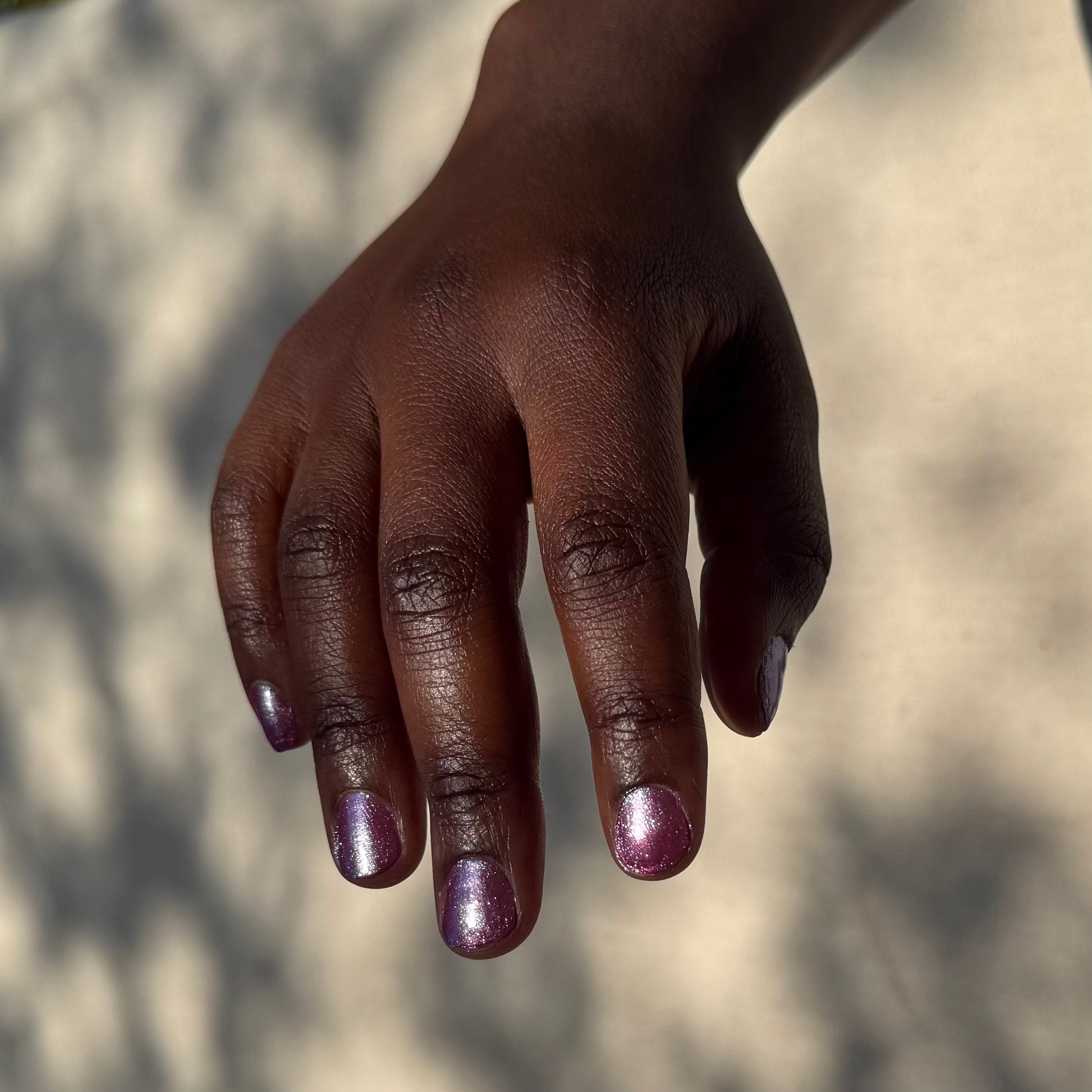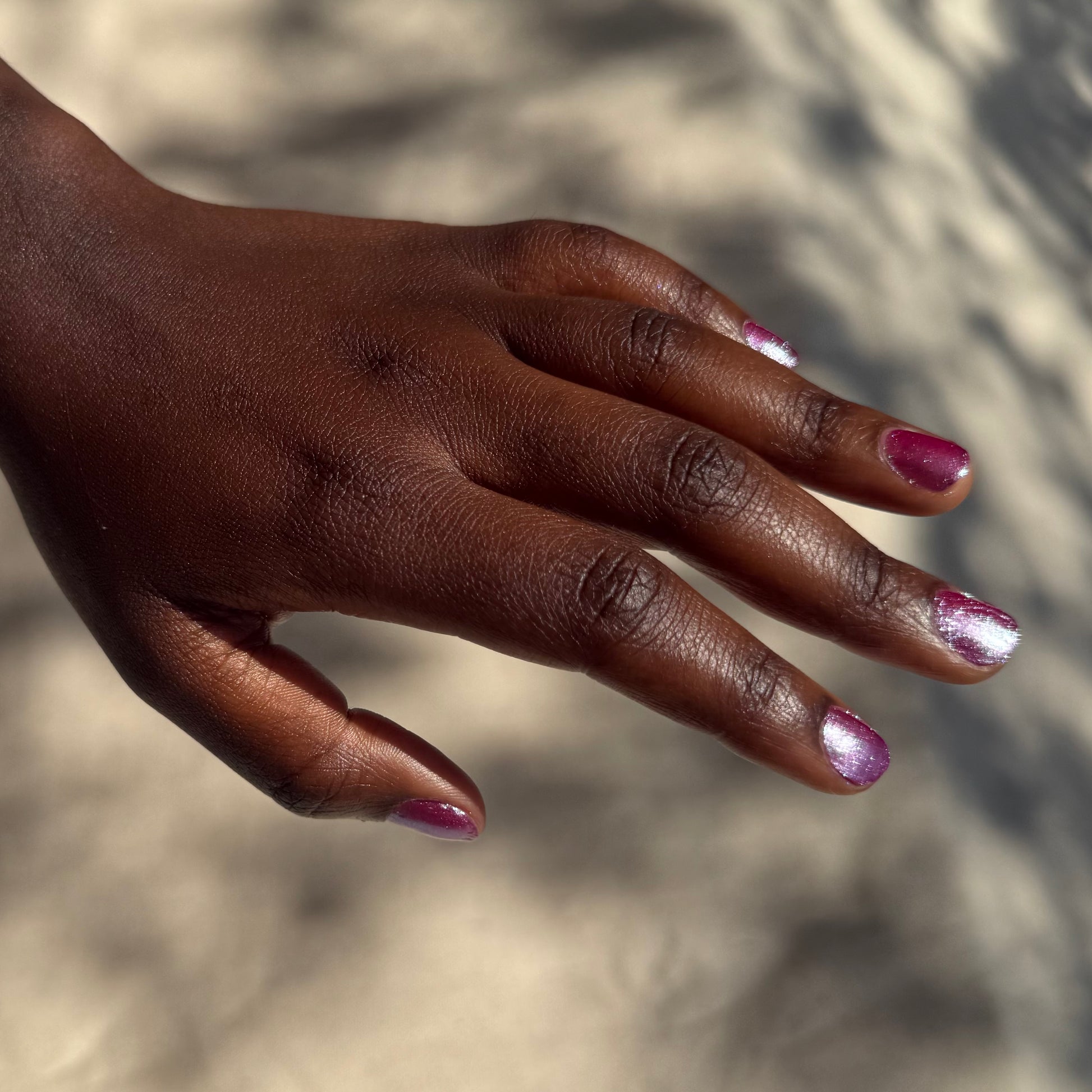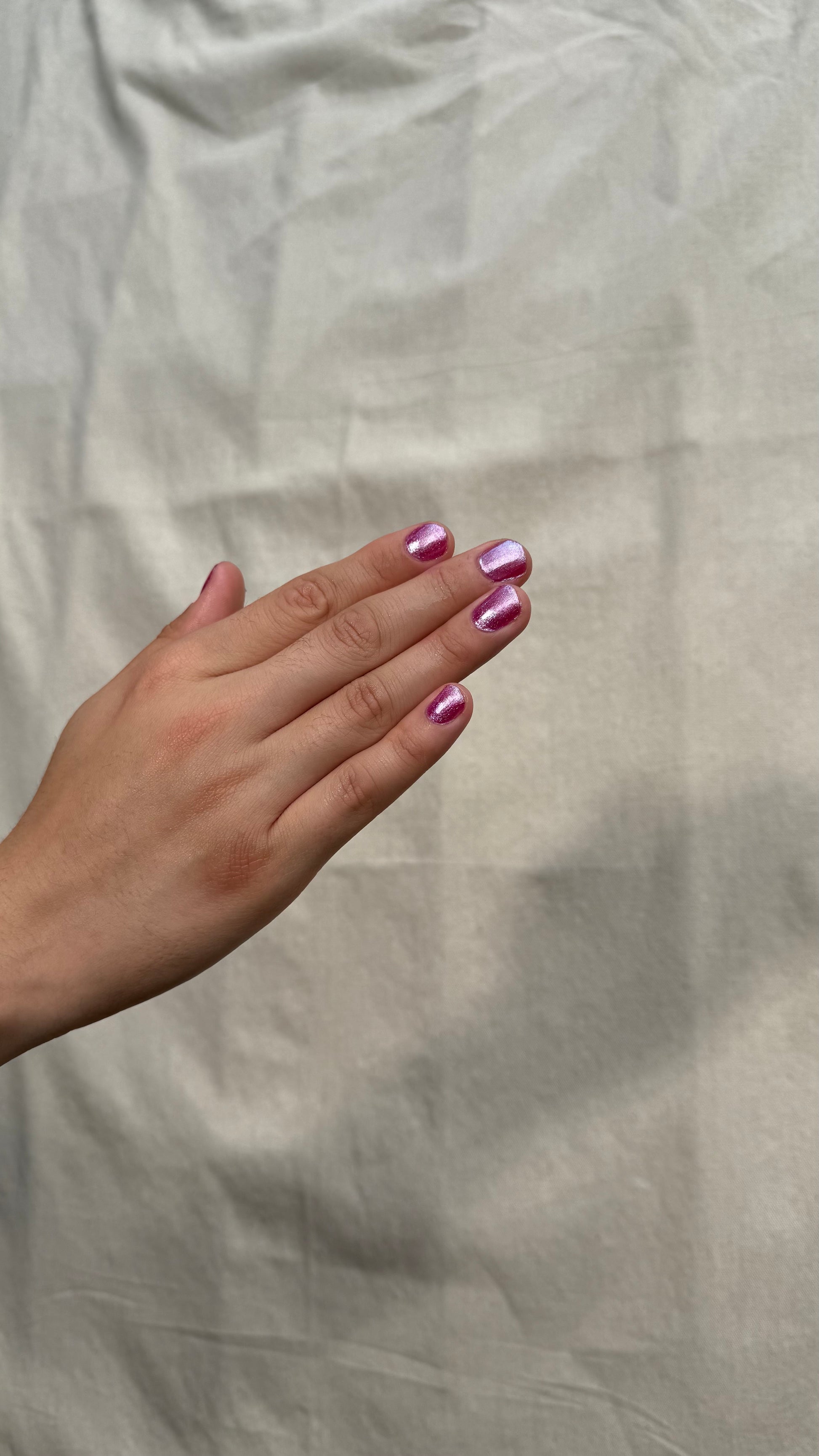 Jelly raspberry base with strong silver shimmer that shifts to blue/green at an angle. Easy application with a frosted, almost metallic finish.