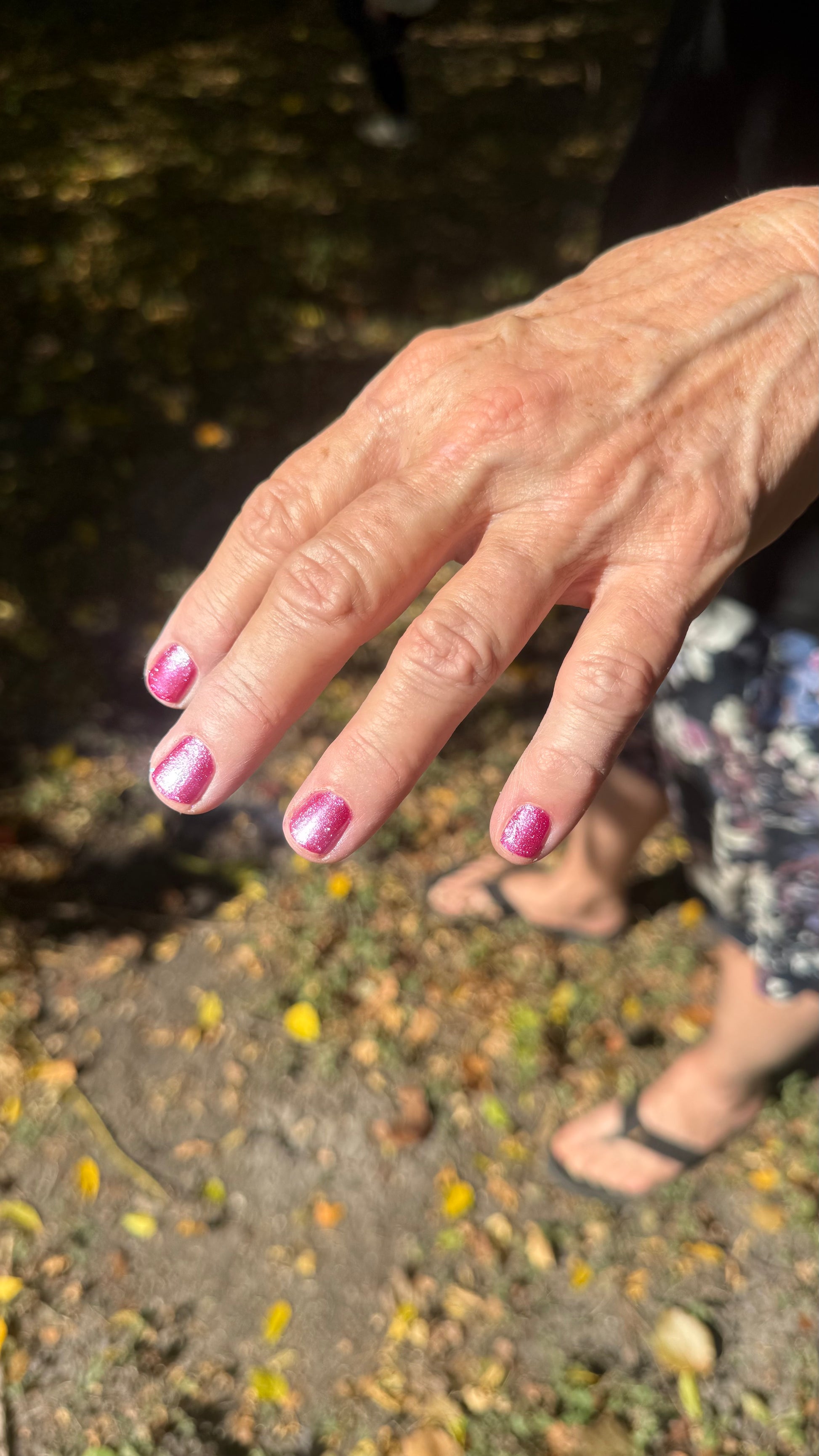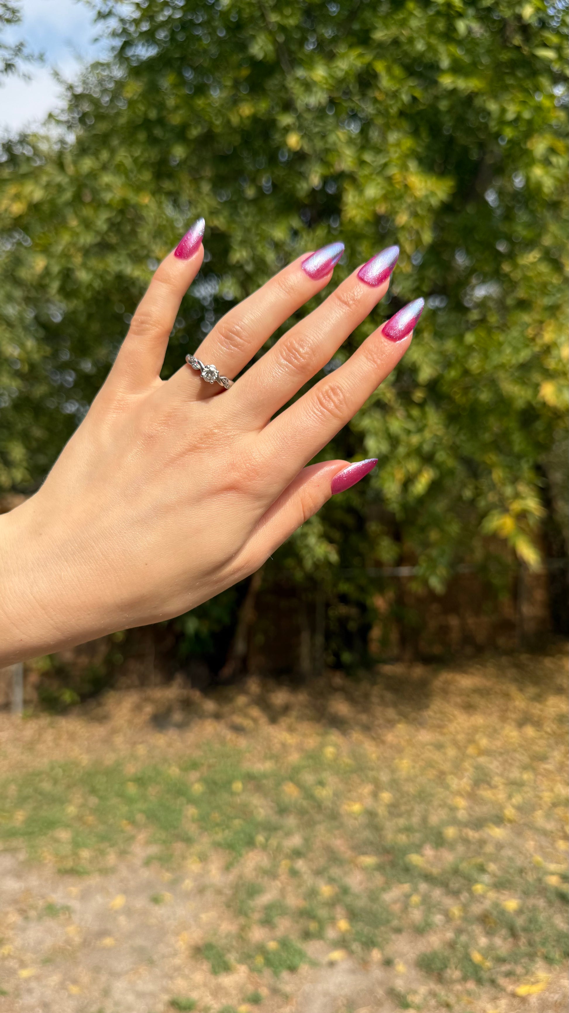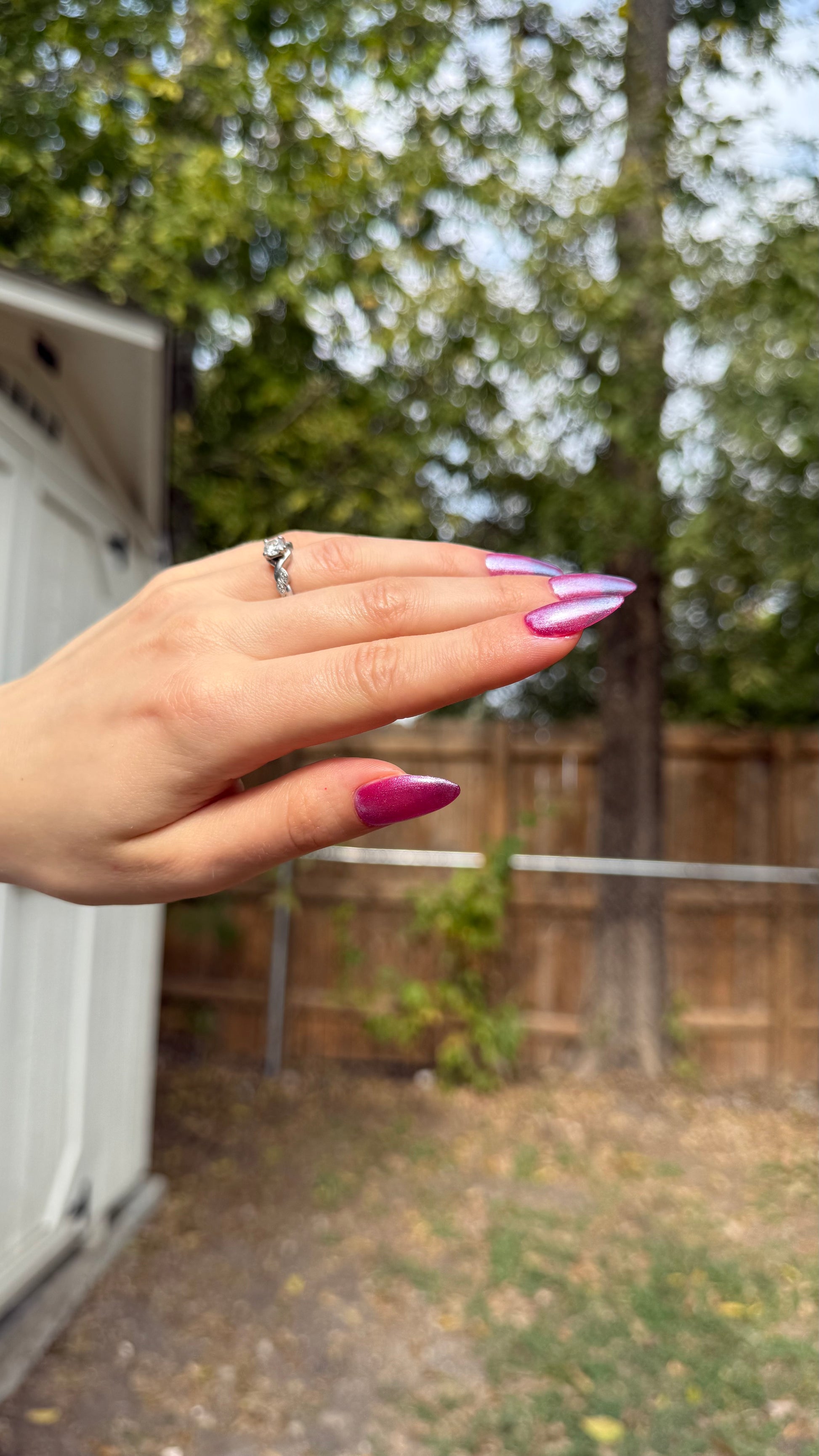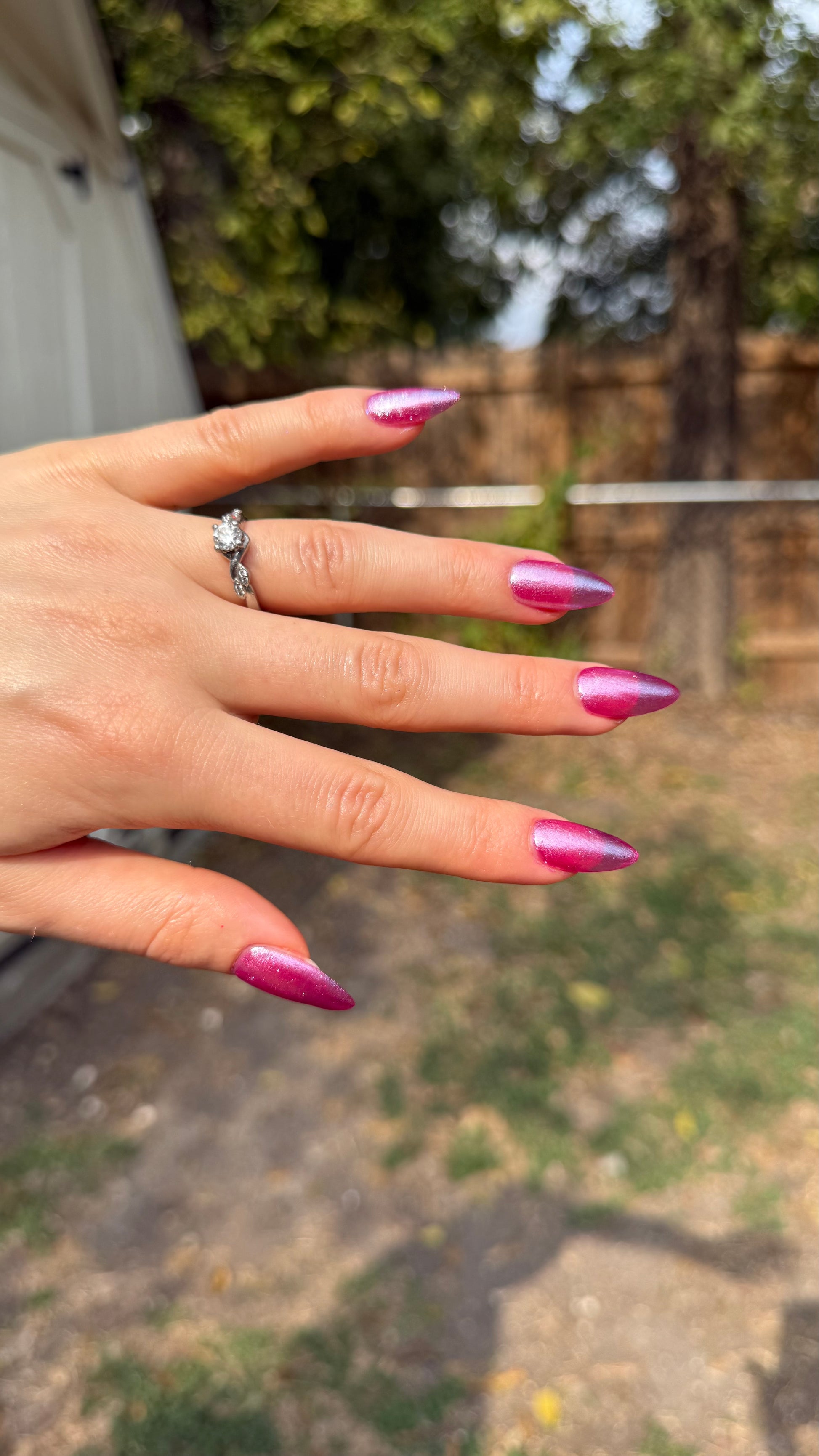 Jelly raspberry base with strong silver shimmer that shifts to blue/green at an angle. Easy application with a frosted, almost metallic finish.