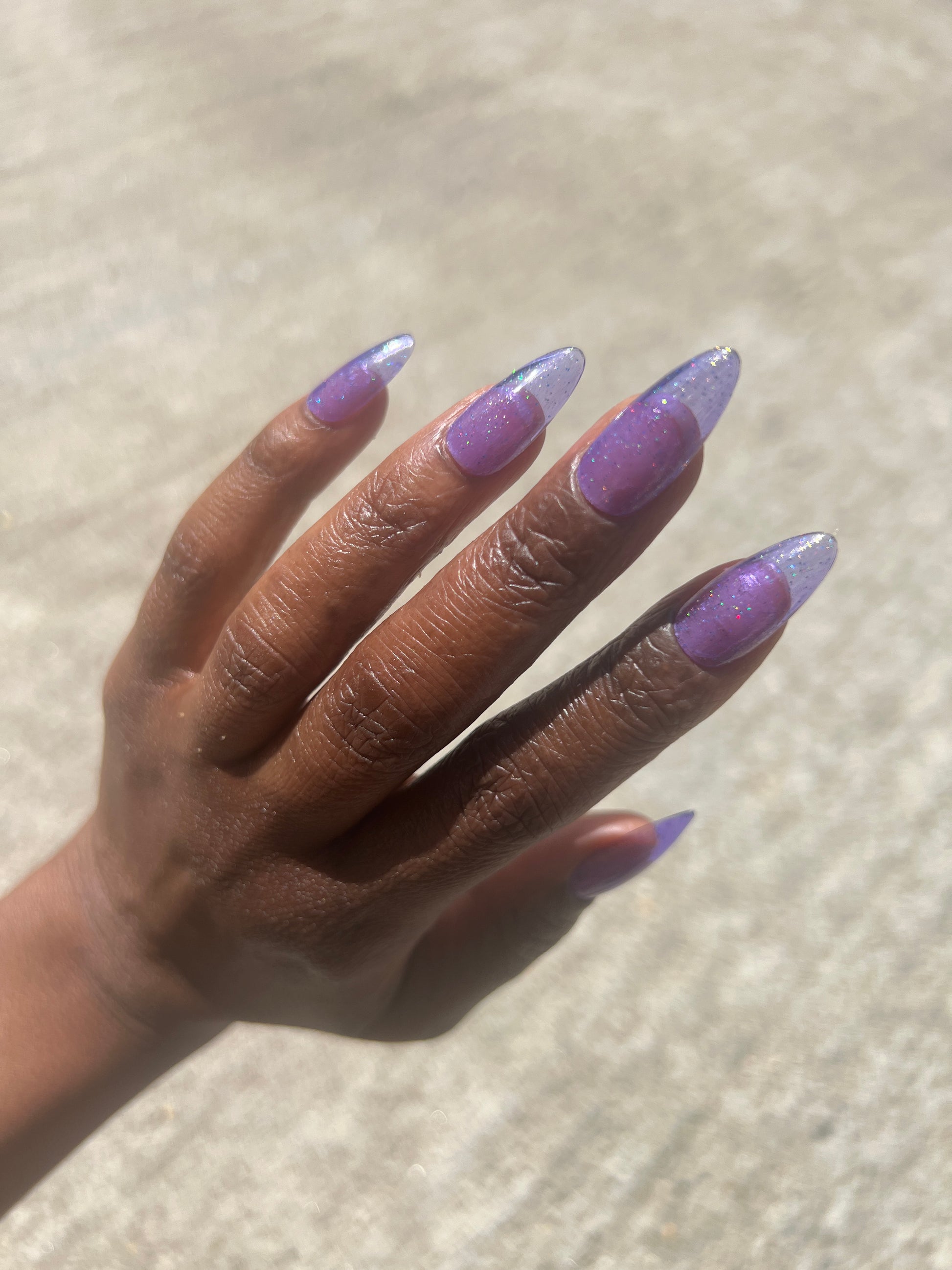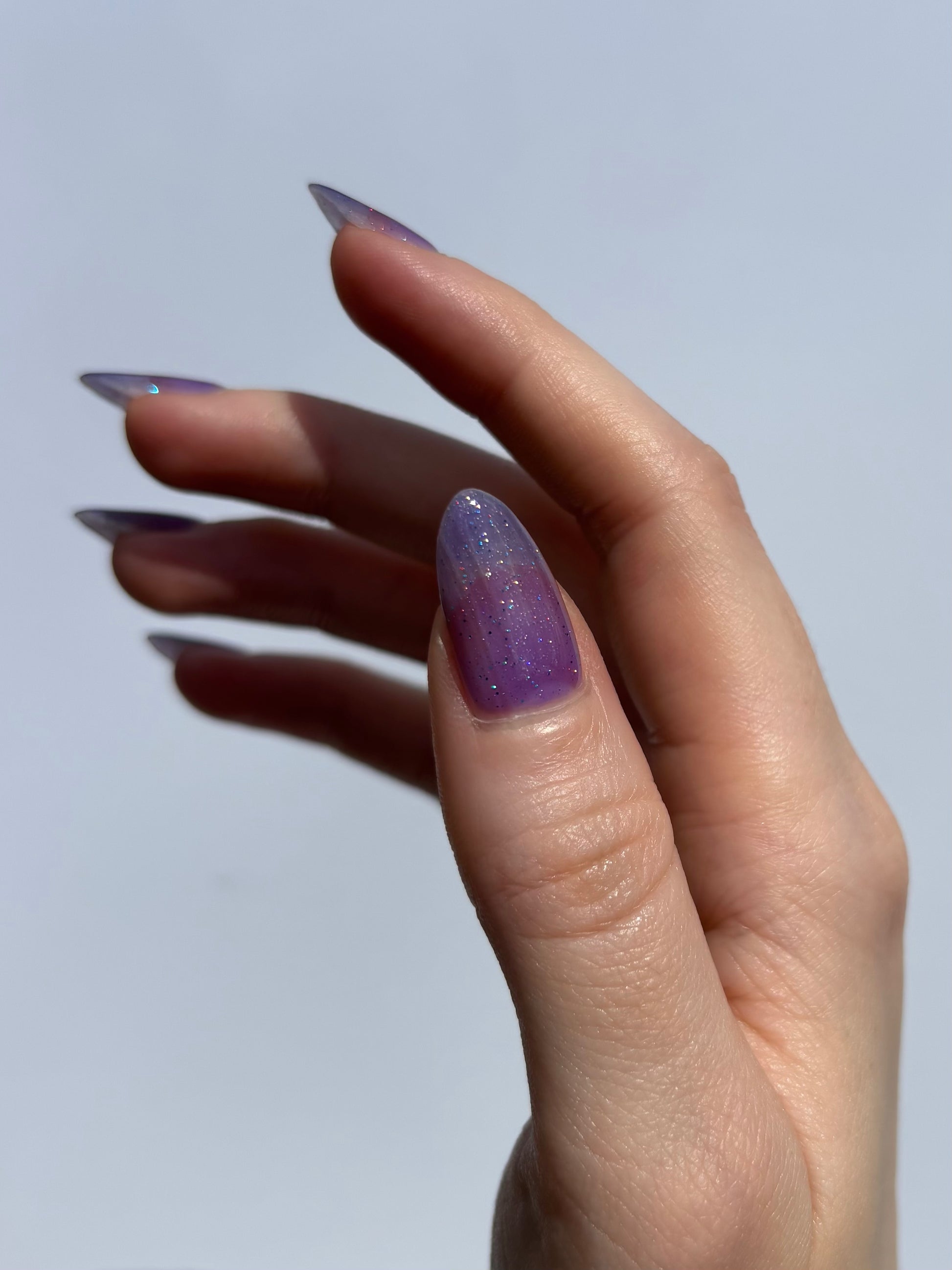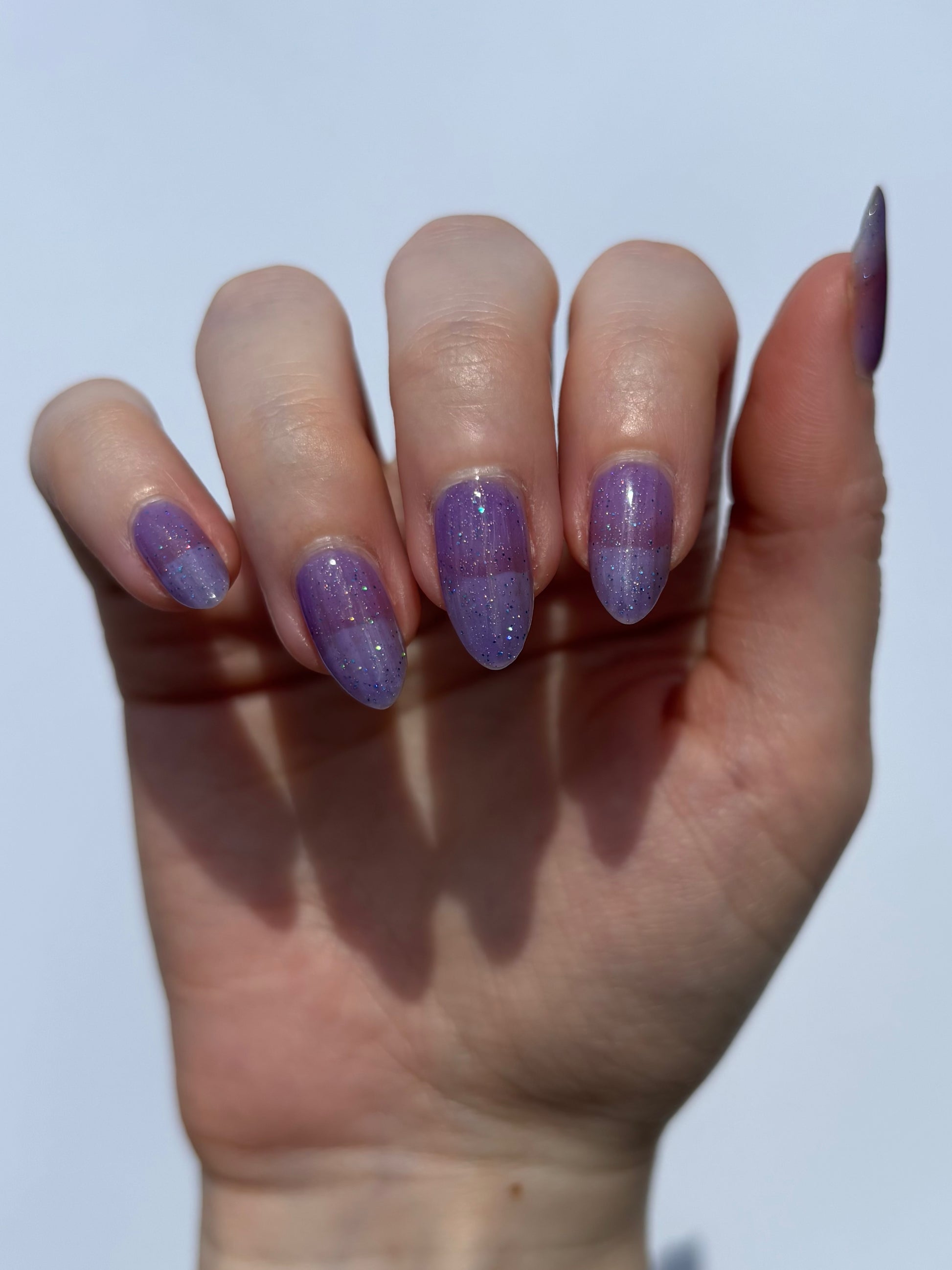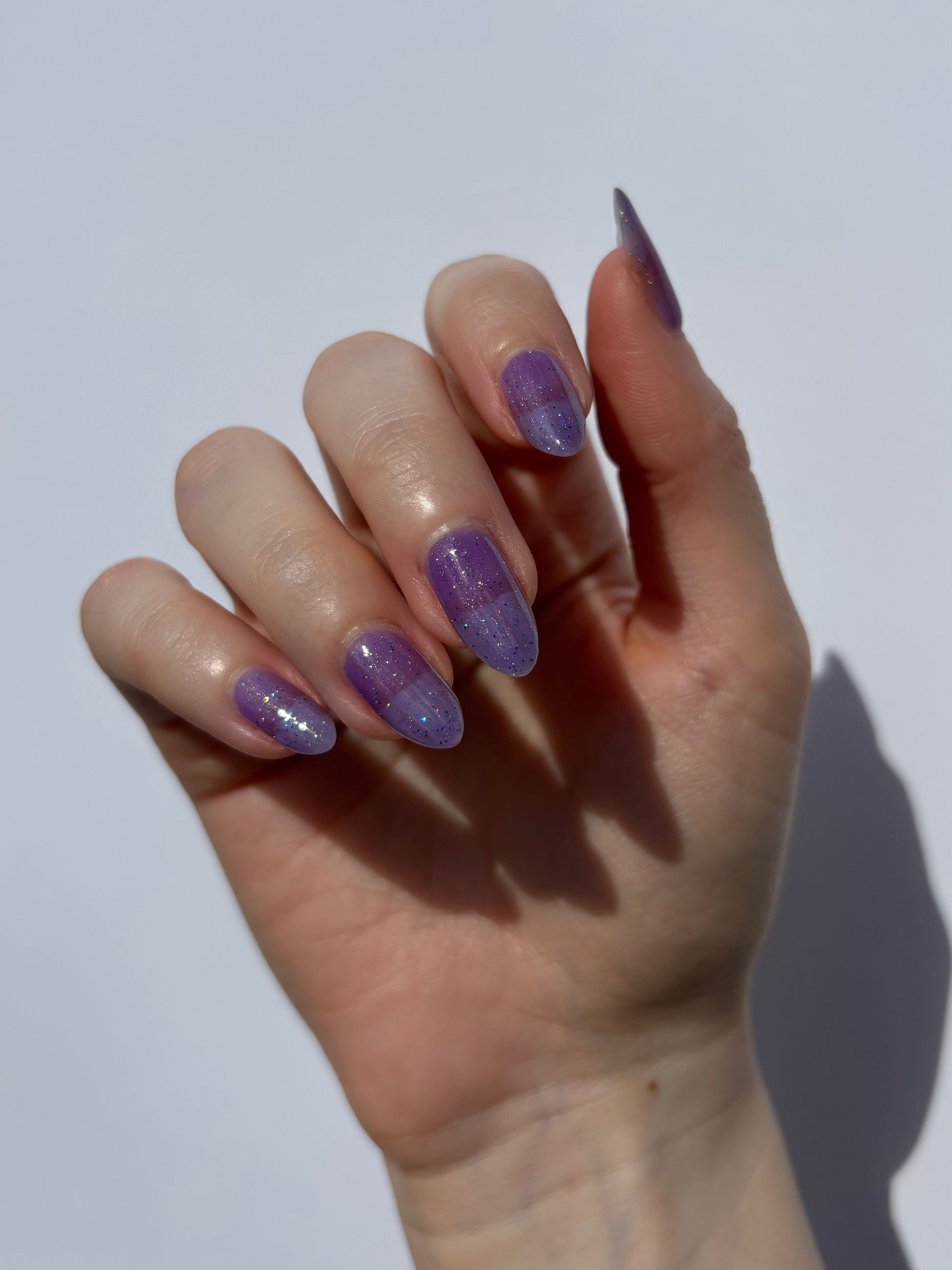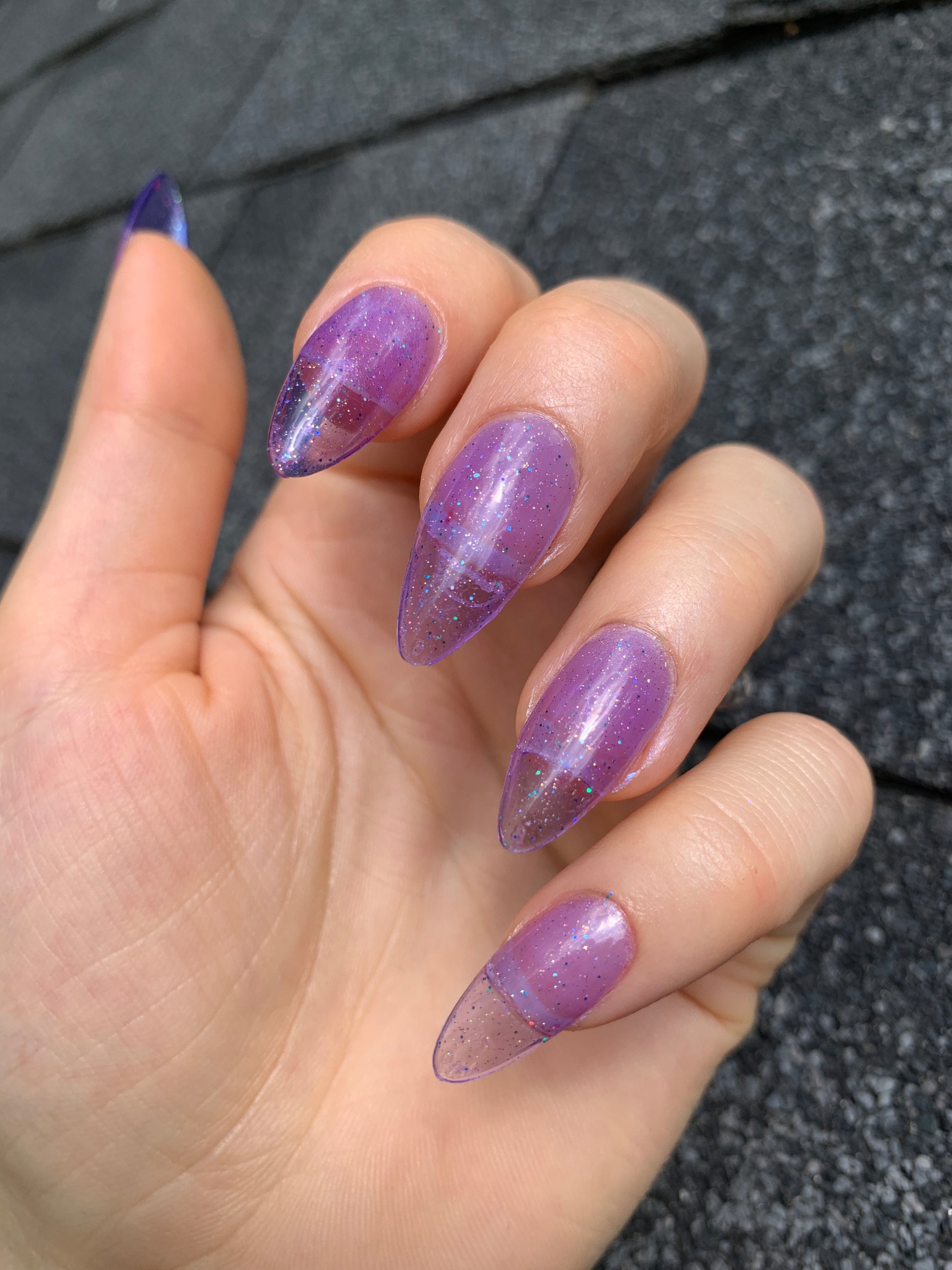 A sheer violet jelly packed with ultra-fine holographic microglitters and specks in a variety of colors and small sizes. Applies smooth and buildable, with a subtle sparkly depth. Inspired by the bouncy ball collection I had growing up. And the 2000's translucent purple blow up chair that I had from Oriental Trading Magazine.
