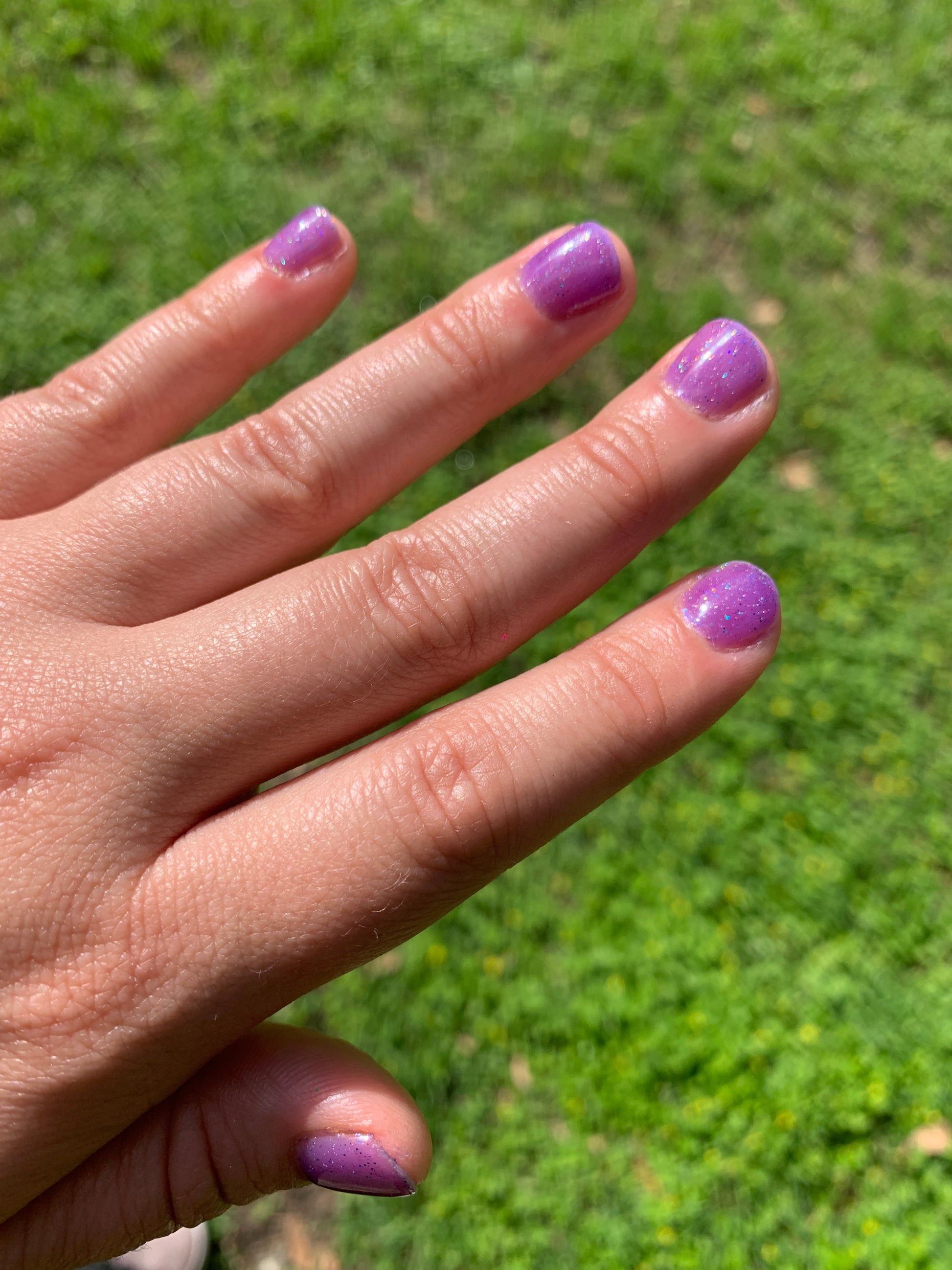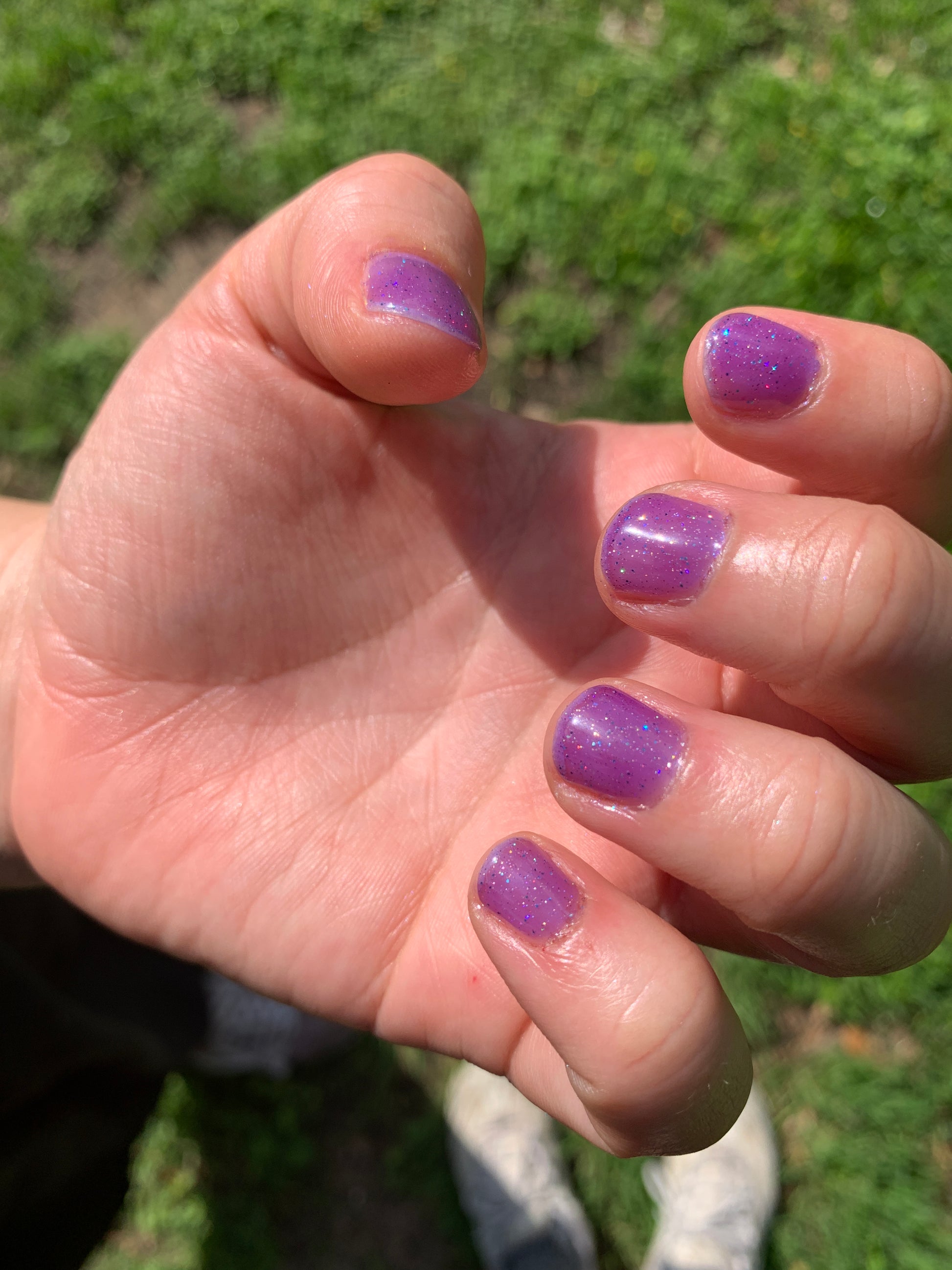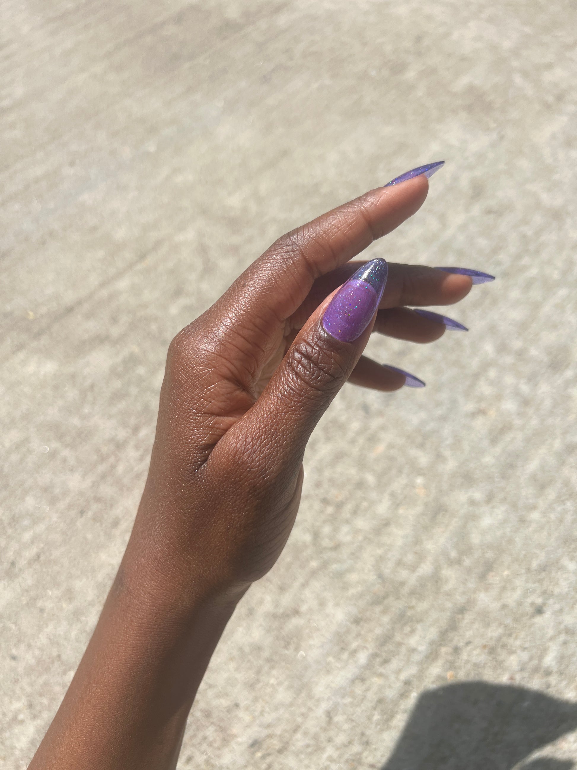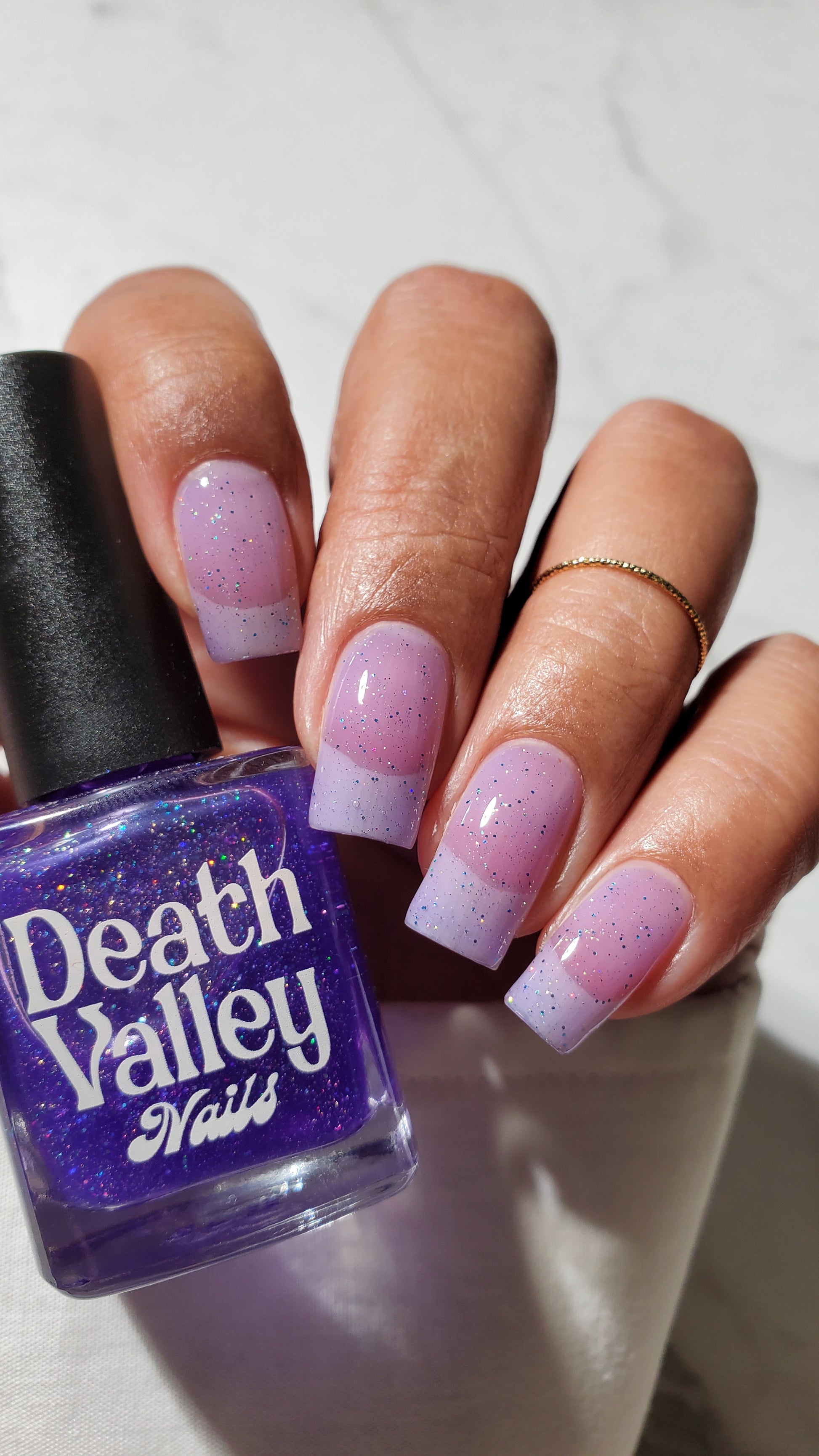 A sheer violet jelly packed with ultra-fine holographic microglitters and specks in a variety of colors and small sizes. Applies smooth and buildable, with a subtle sparkly depth. Inspired by the bouncy ball collection I had growing up. And the 2000's translucent purple blow up chair that I had from Oriental Trading Magazine.