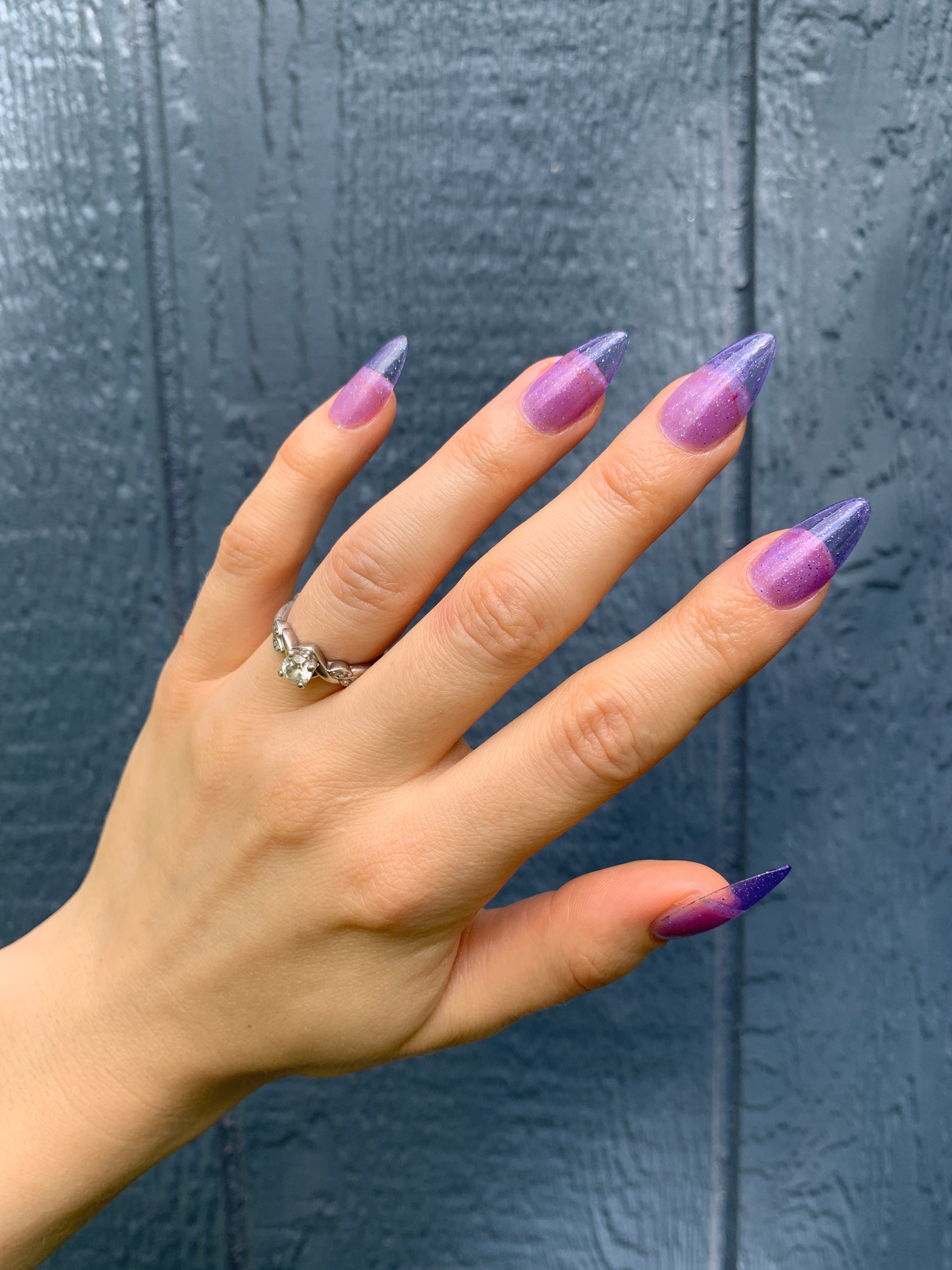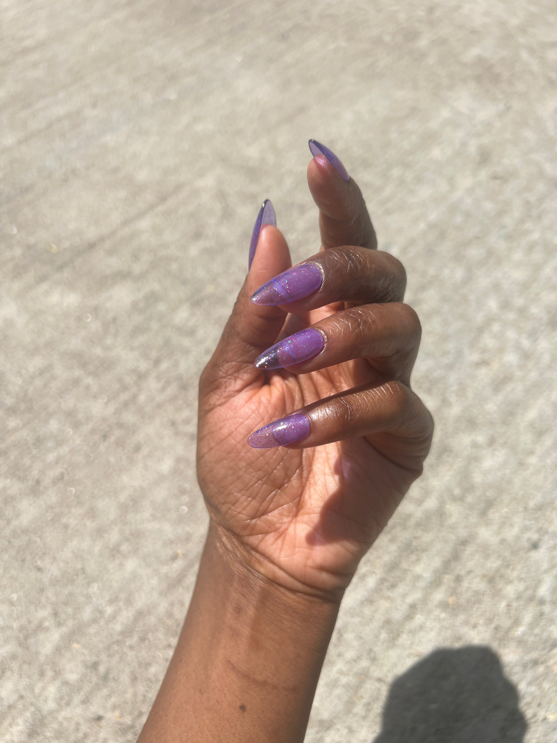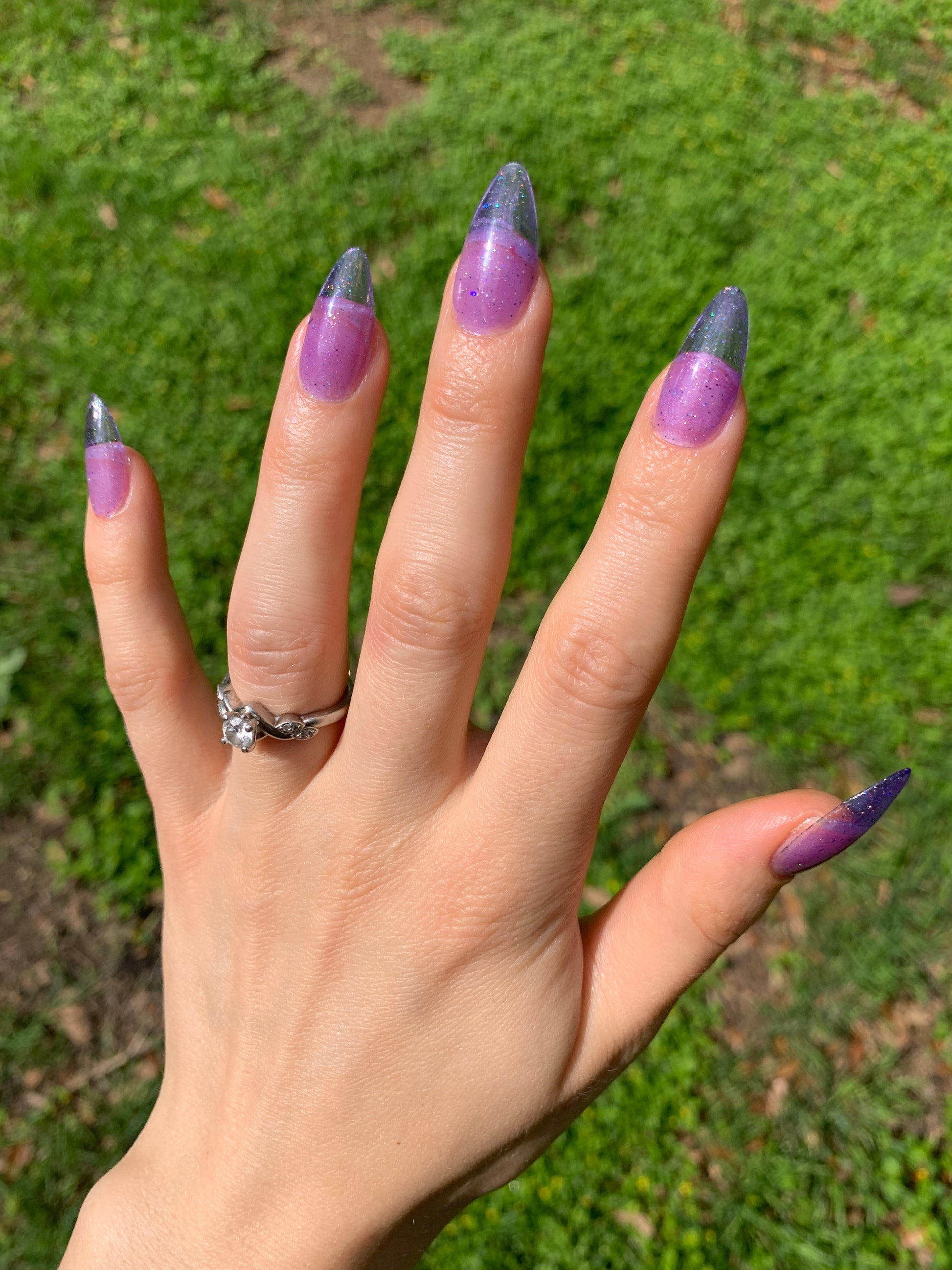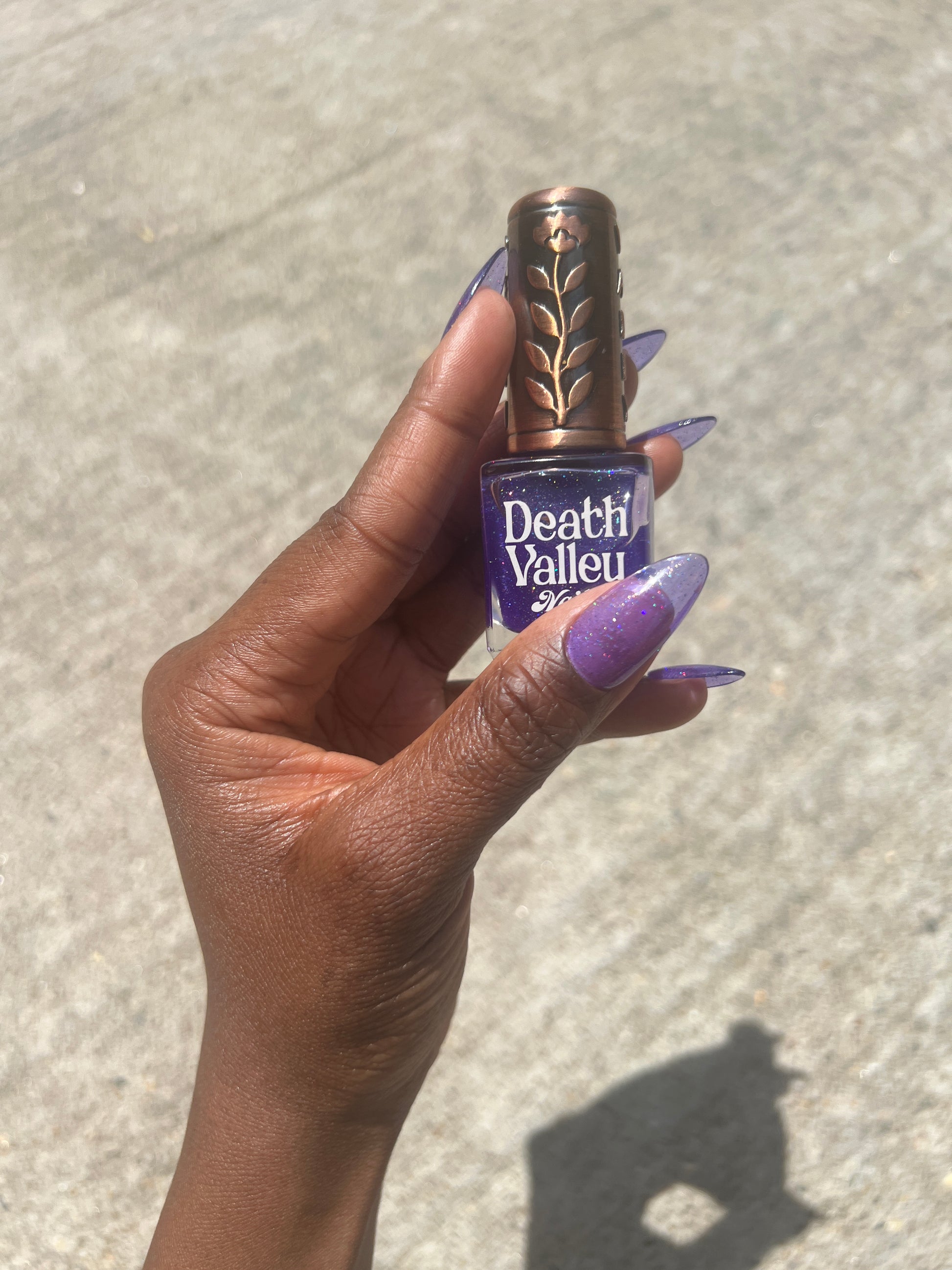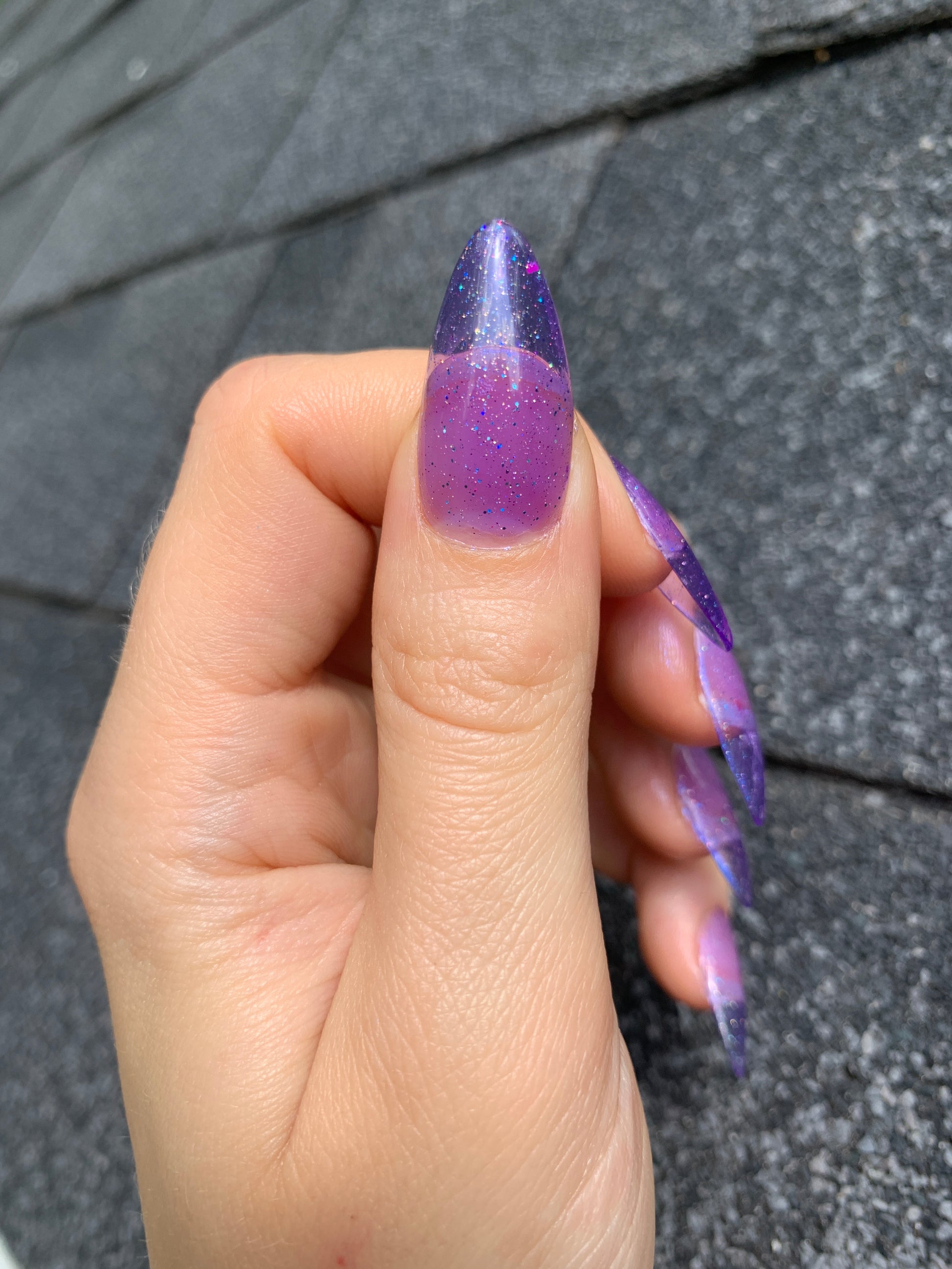 A sheer violet jelly packed with ultra-fine holographic microglitters and specks in a variety of colors and small sizes. Applies smooth and buildable, with a subtle sparkly depth. Inspired by the bouncy ball collection I had growing up. And the 2000's translucent purple blow up chair that I had from Oriental Trading Magazine.