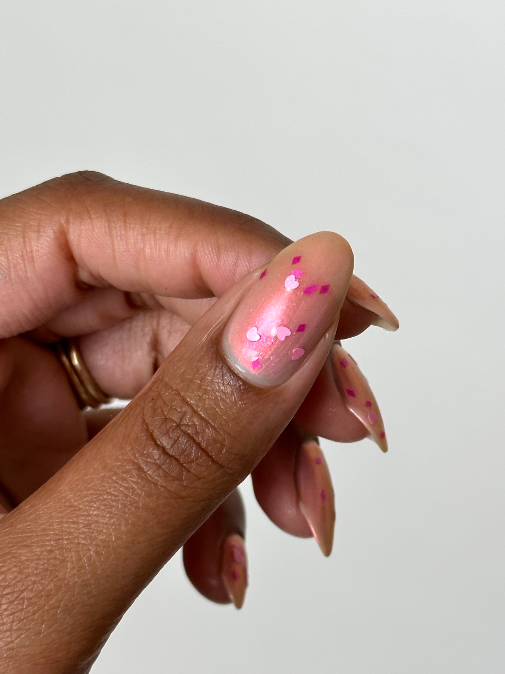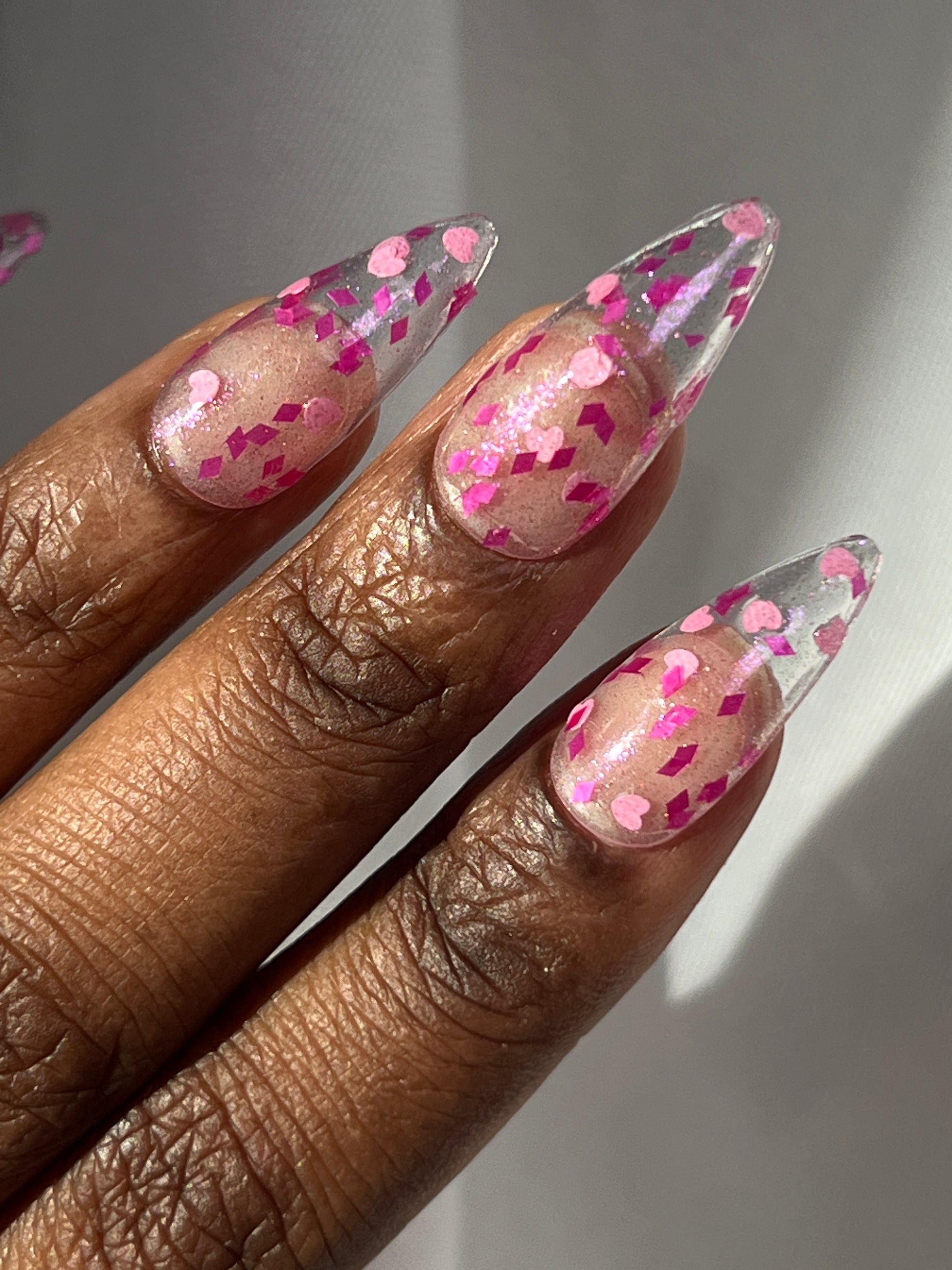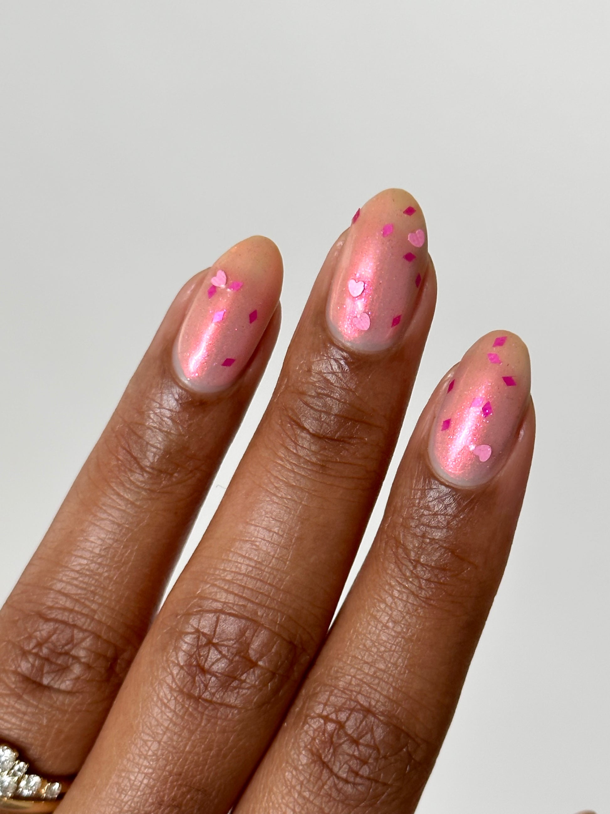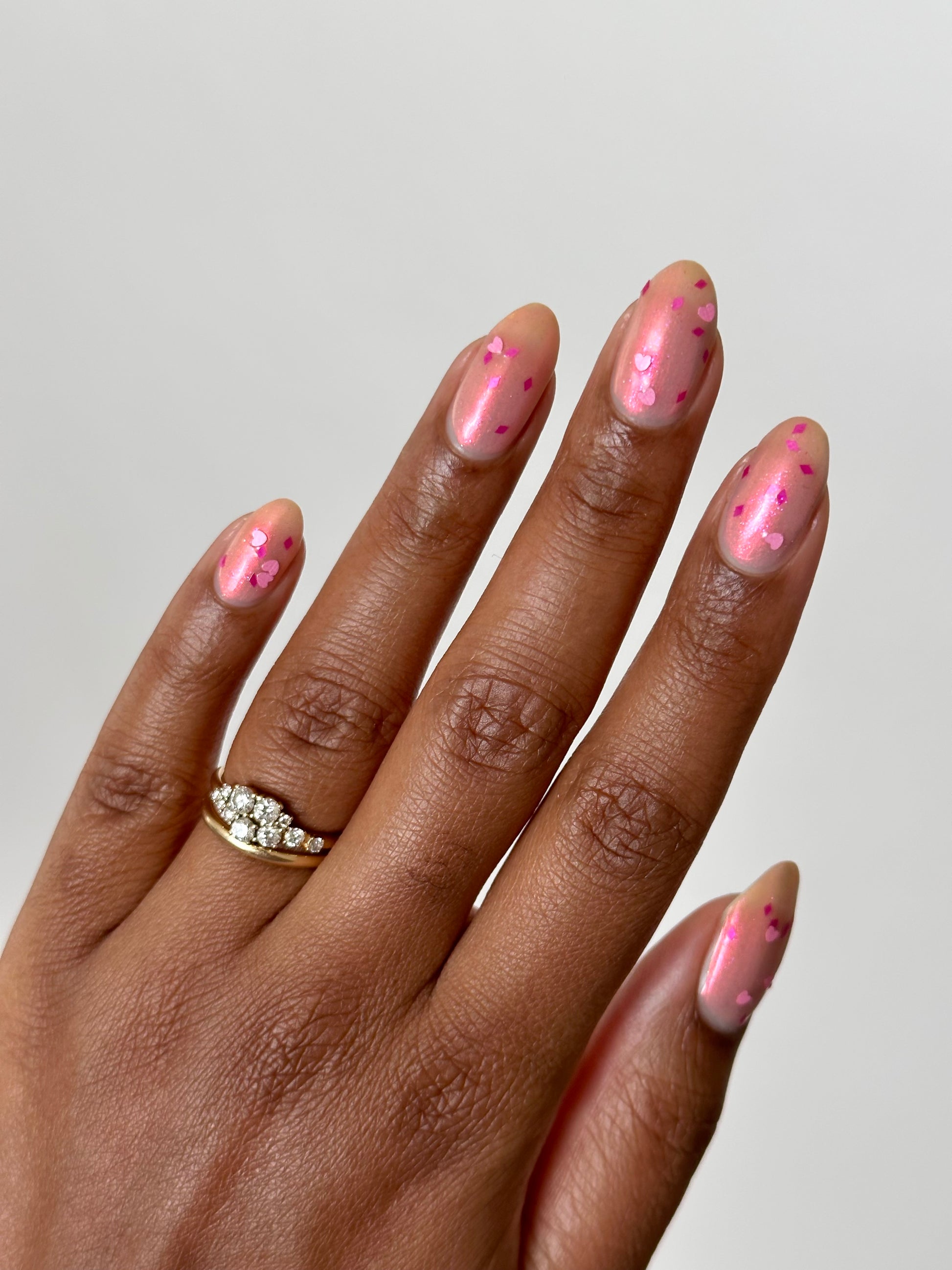 Matte cotton candy hearts coupled with magenta diamonds suspended in pink/gold micro glitter with a sheer base.