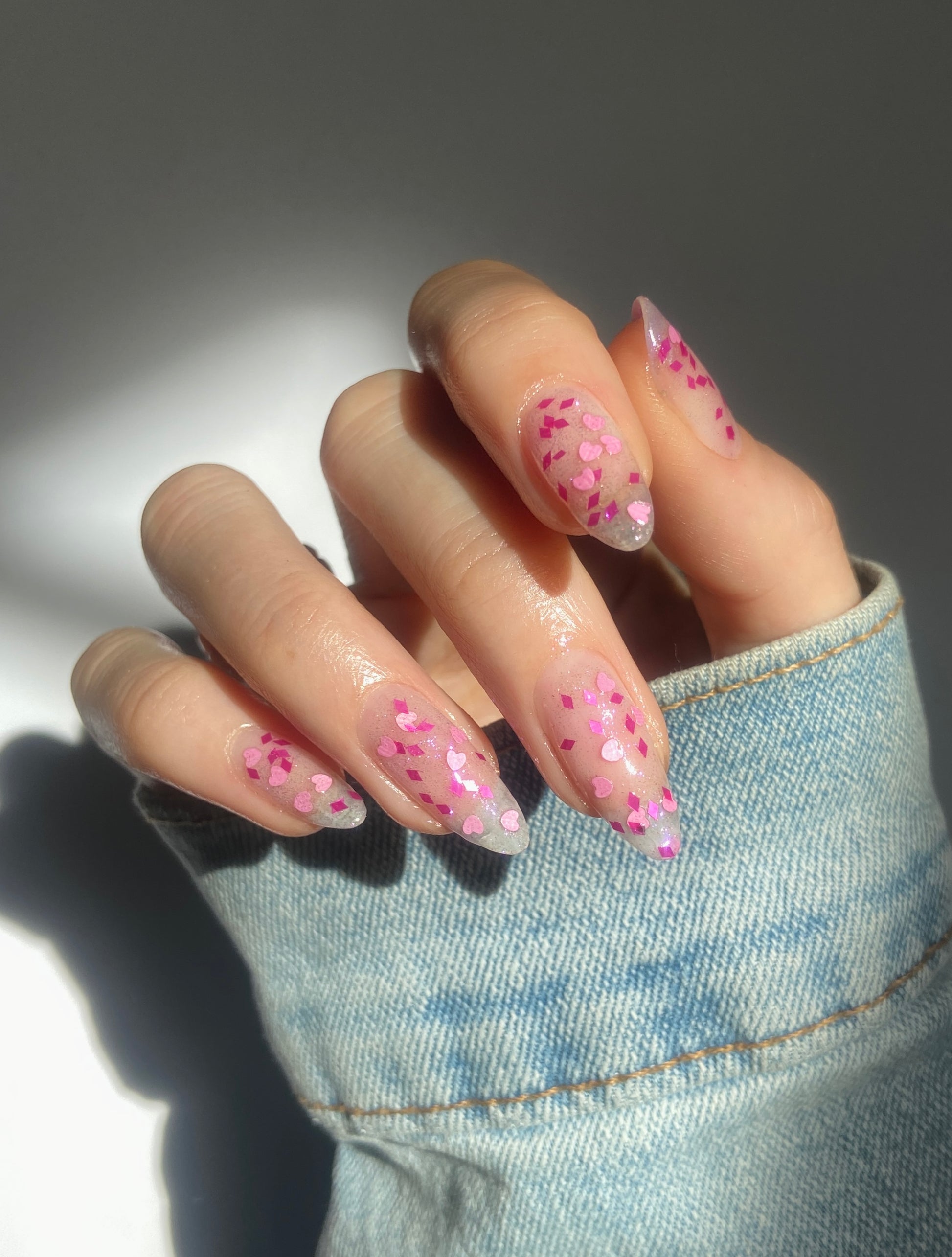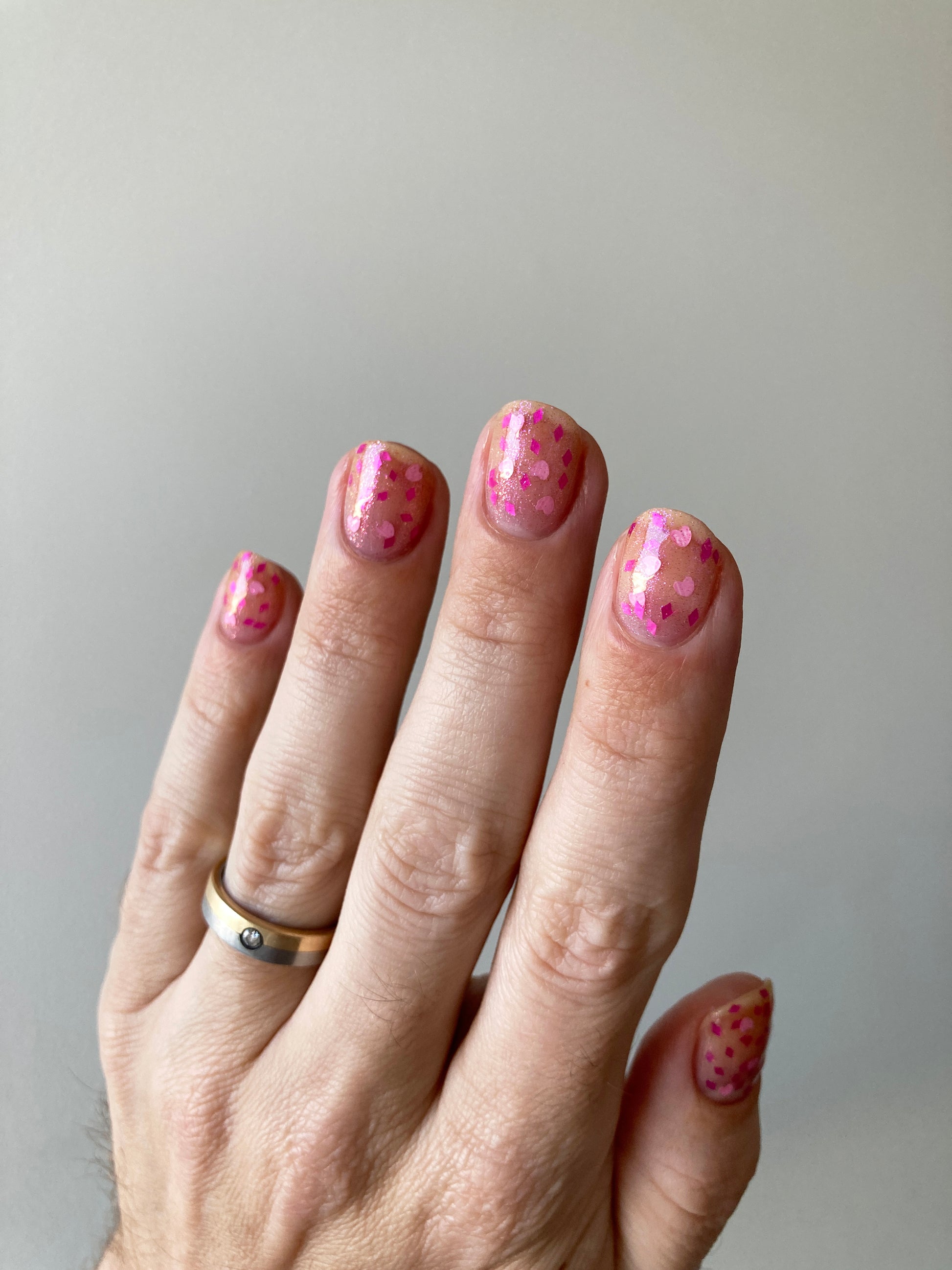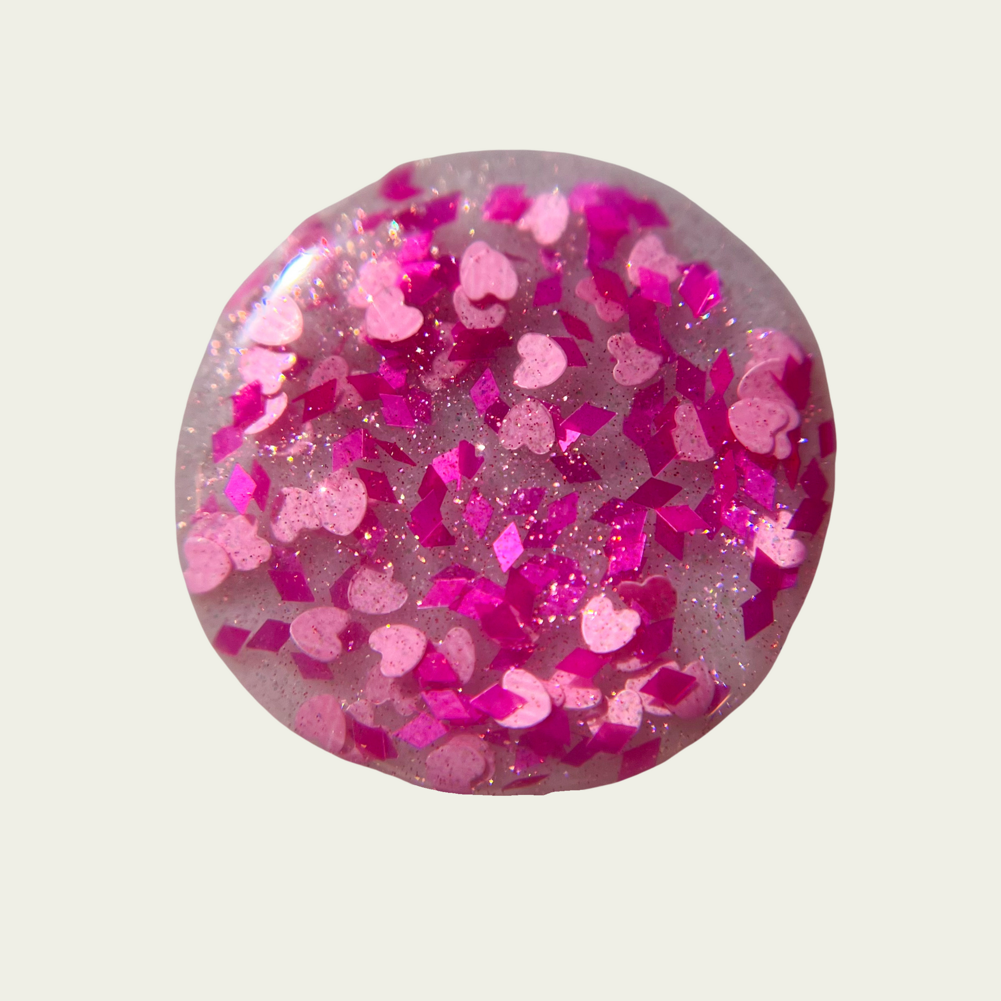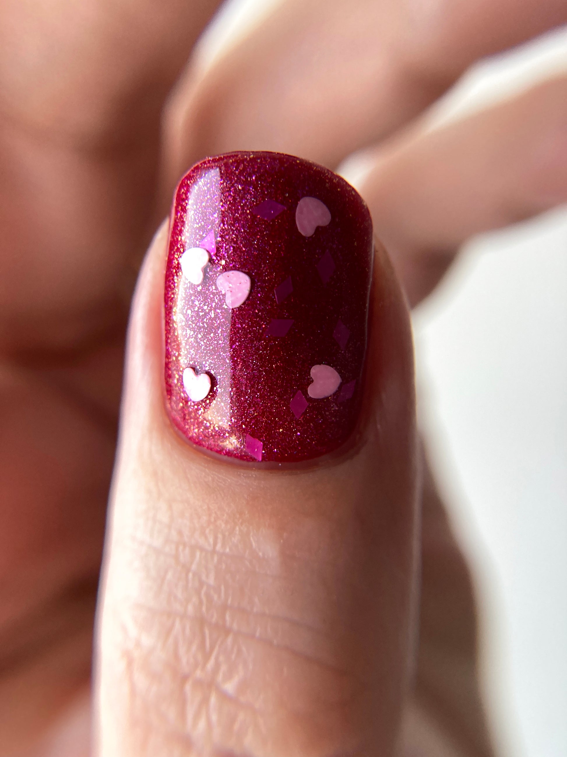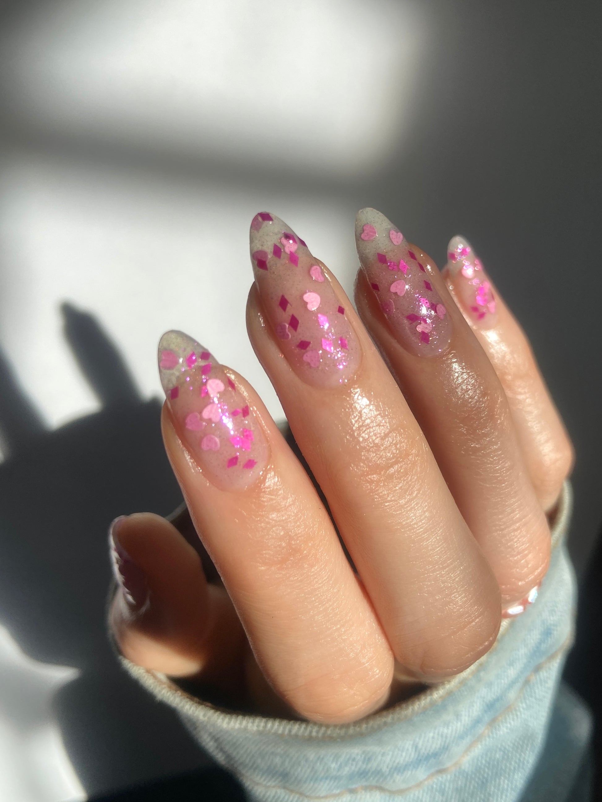 Matte cotton candy hearts coupled with magenta diamonds suspended in pink/gold micro glitter with a sheer base.