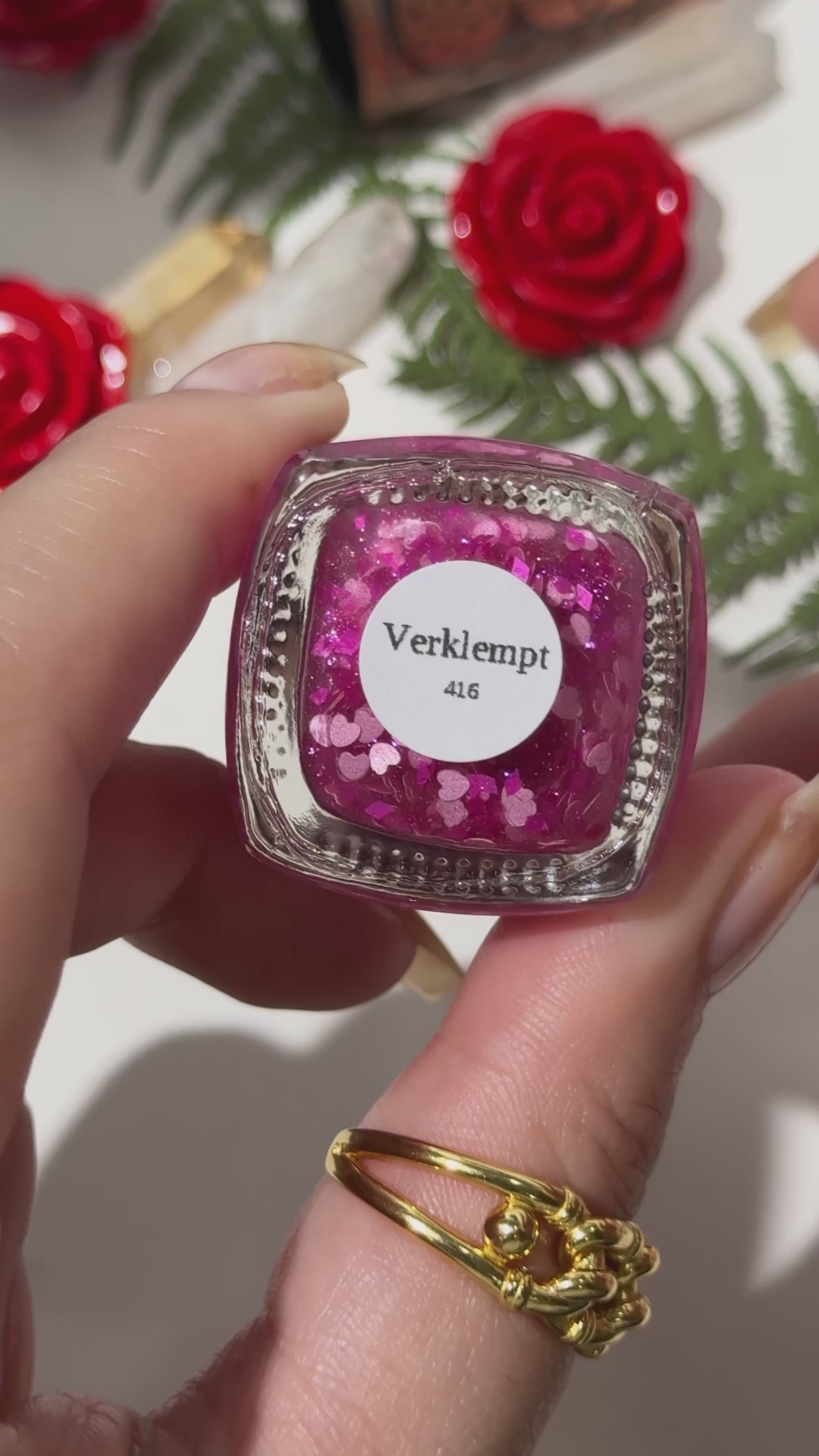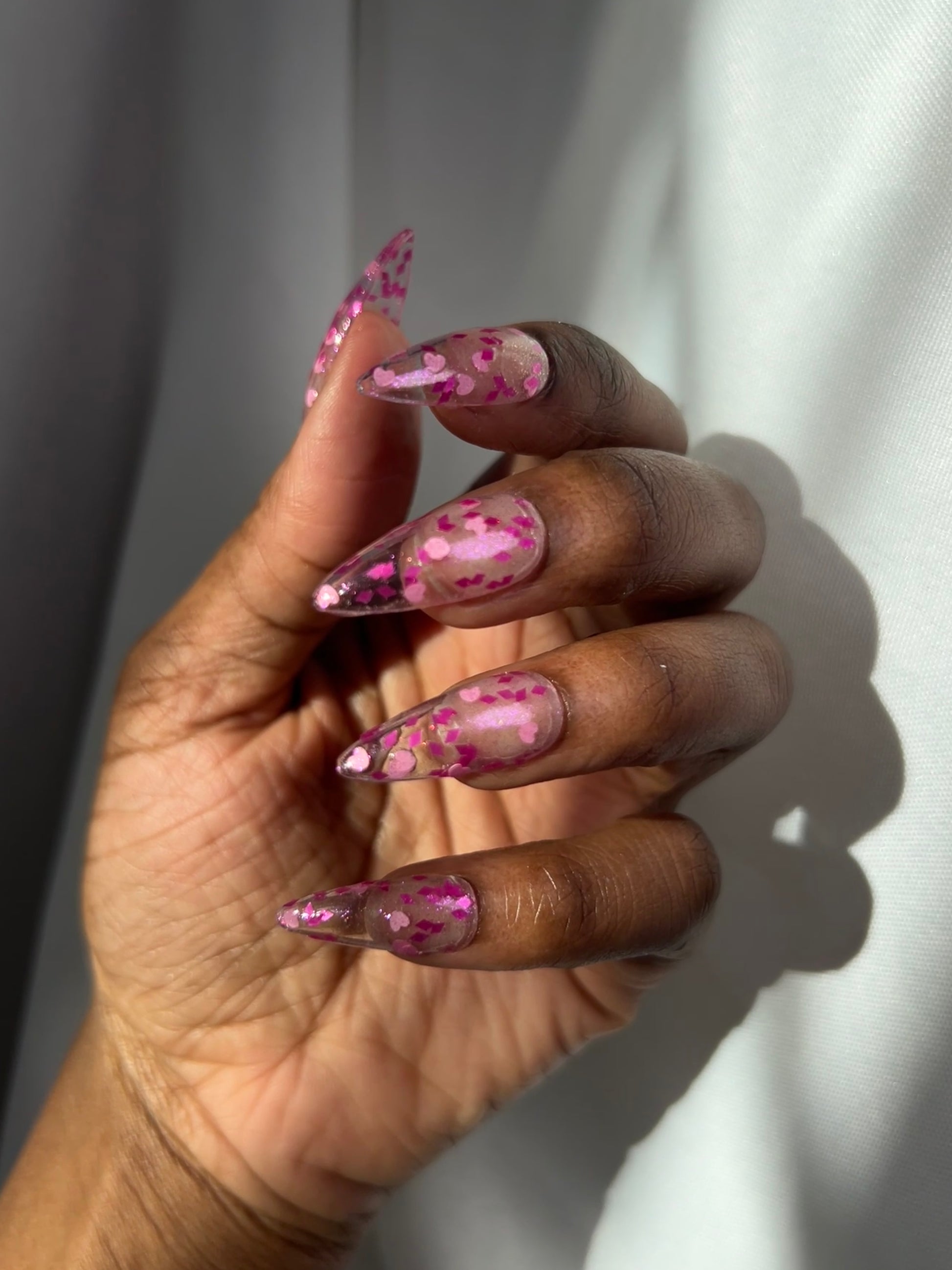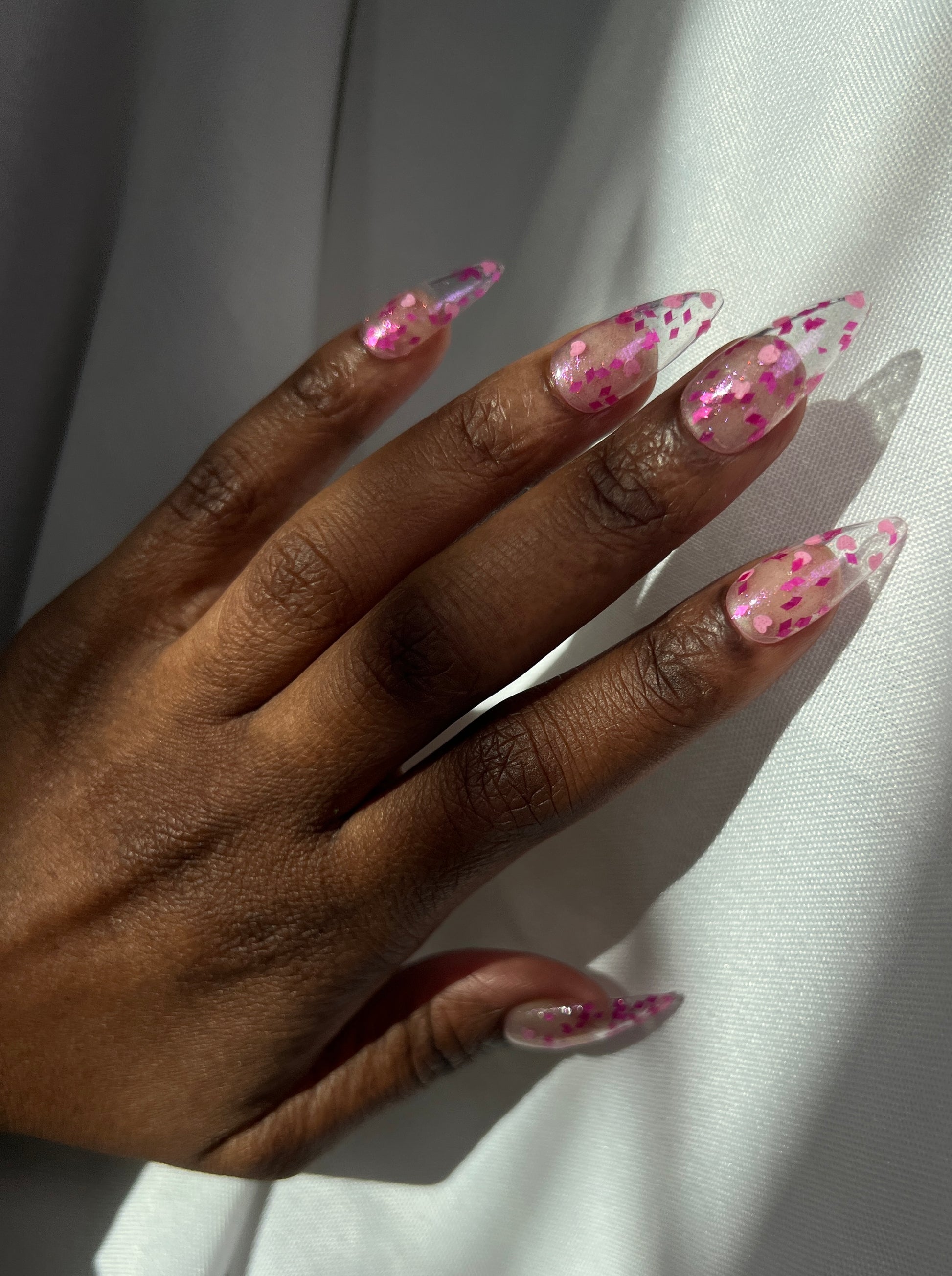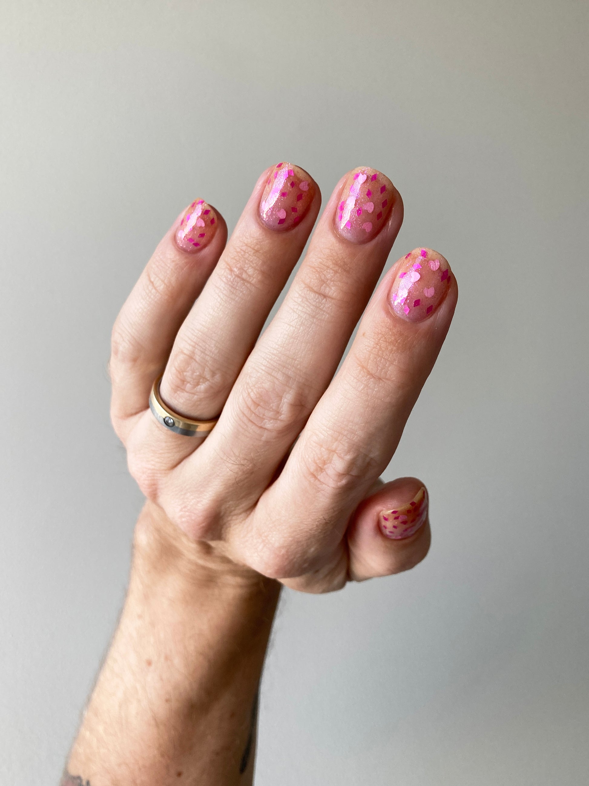 Matte cotton candy hearts coupled with magenta diamonds suspended in pink/gold micro glitter with a sheer base.