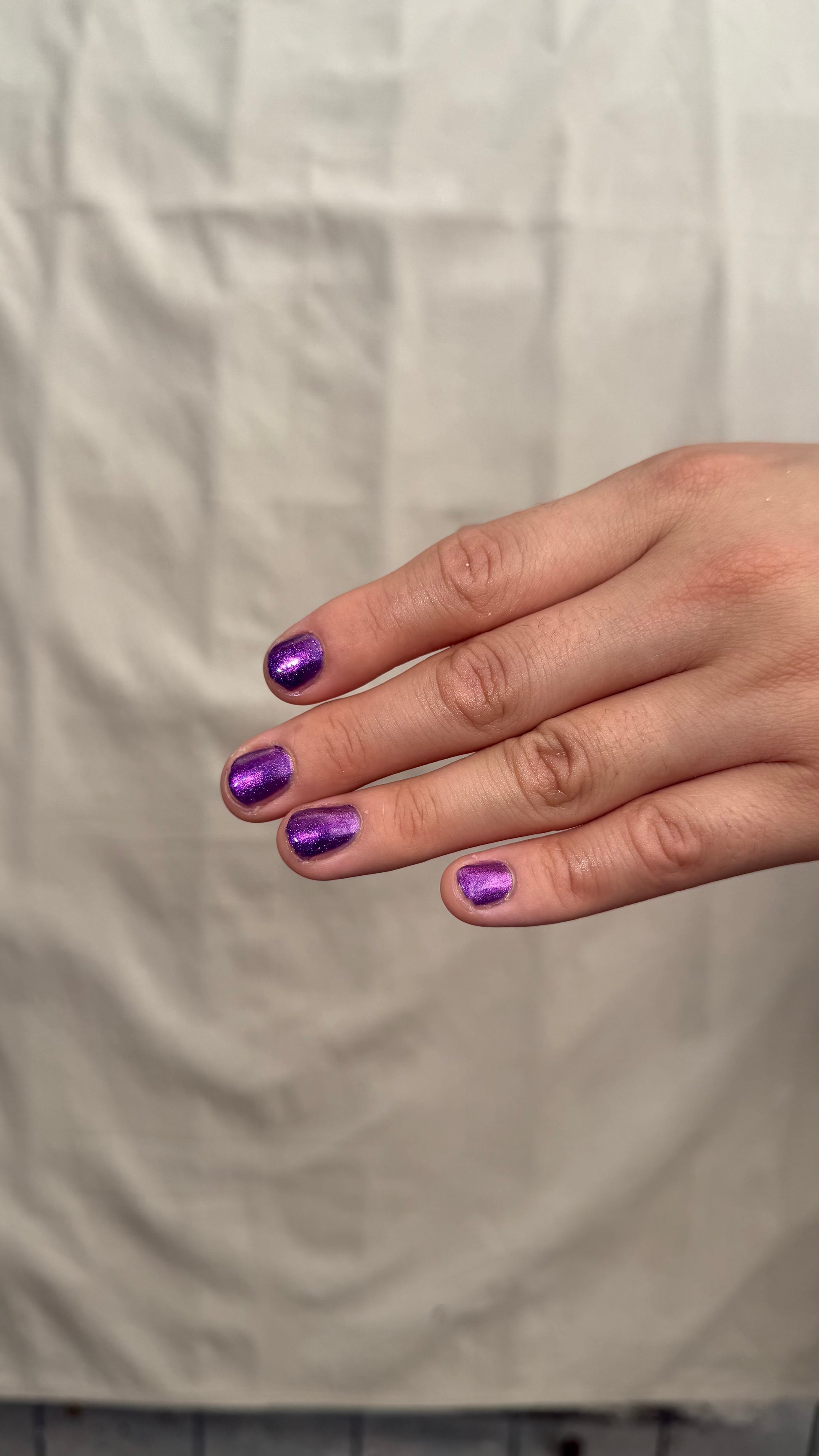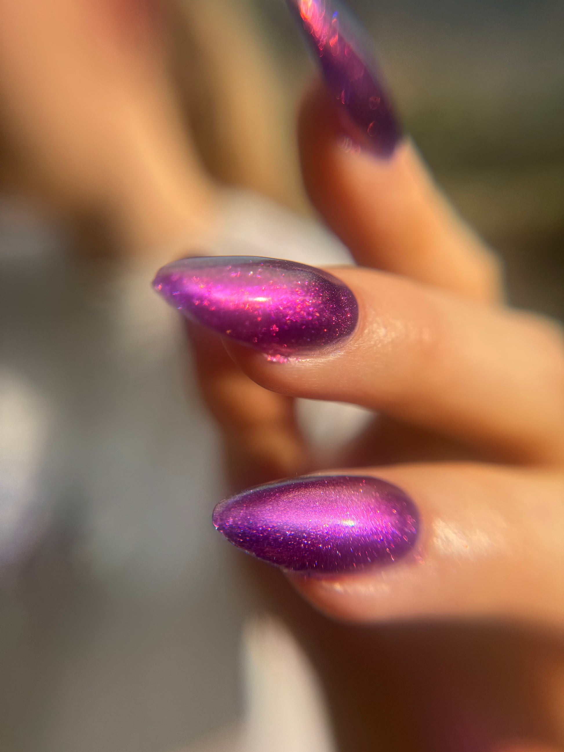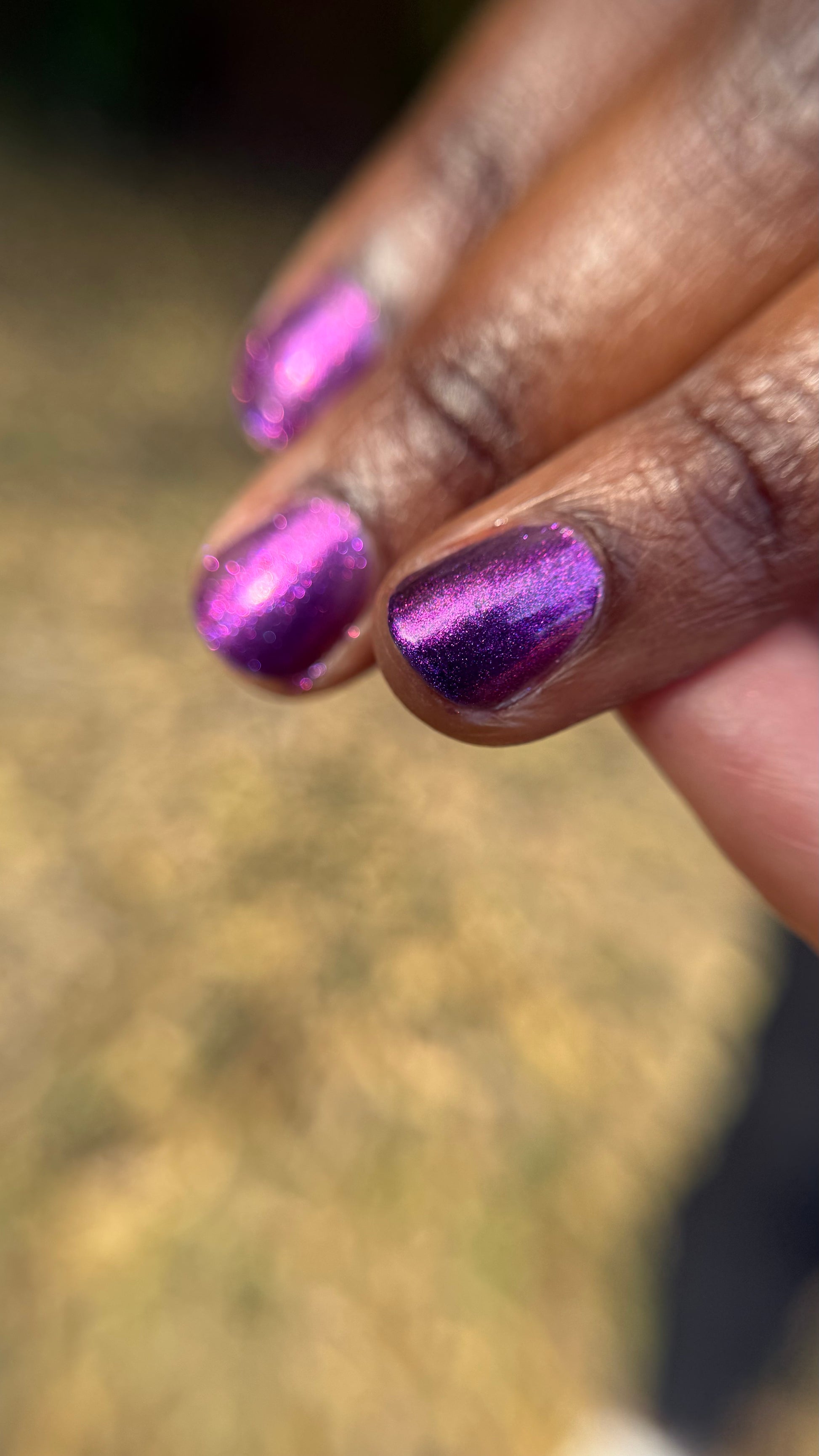 Saturated royal-violet shimmer with glowy fuchsia/raspberry metallic shimmer with a warm gold/green shift at the edges. Feels like a metallic grape soda can: bright and punchy.