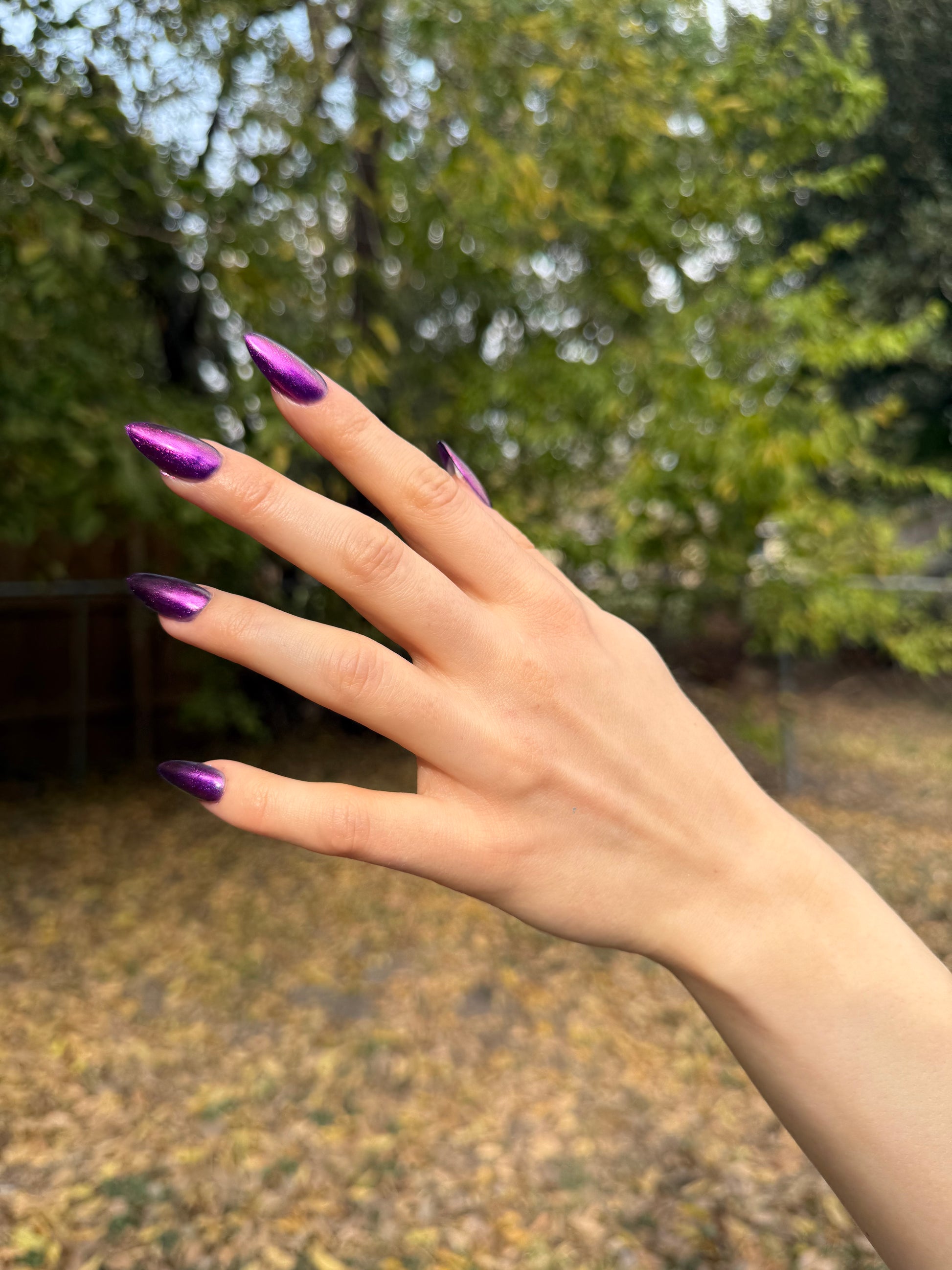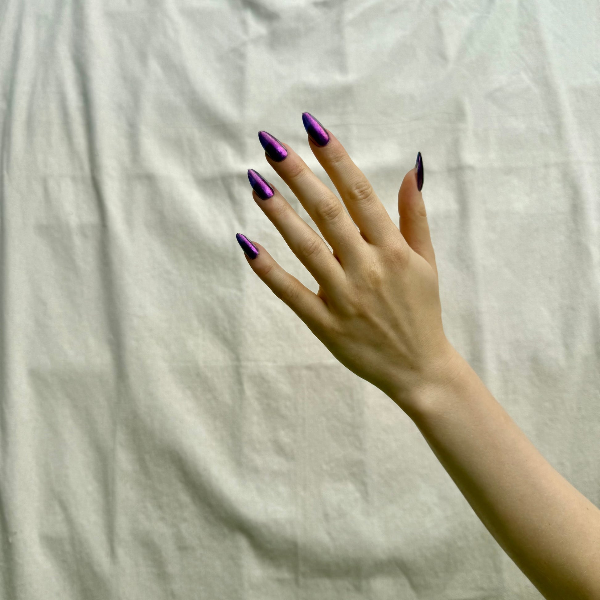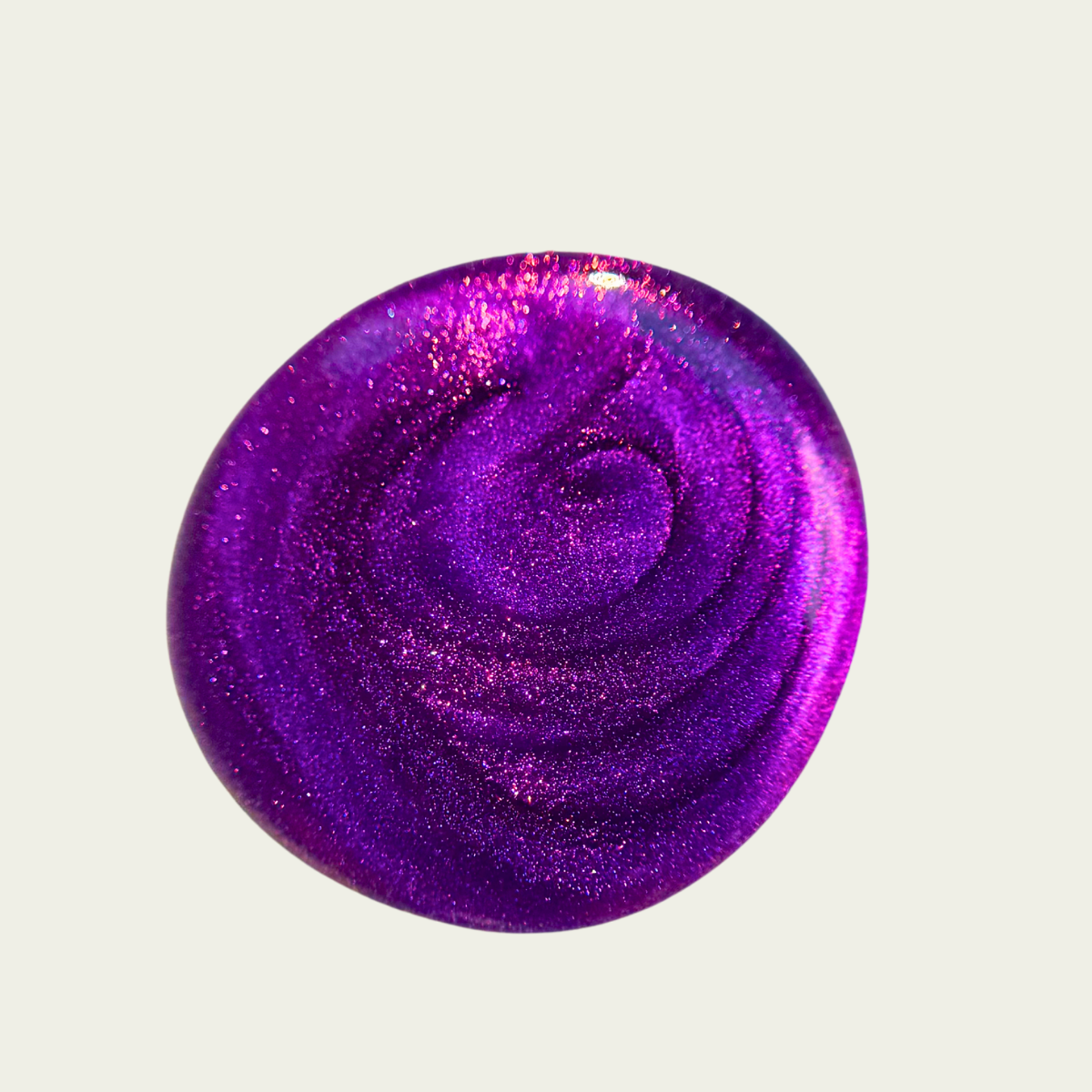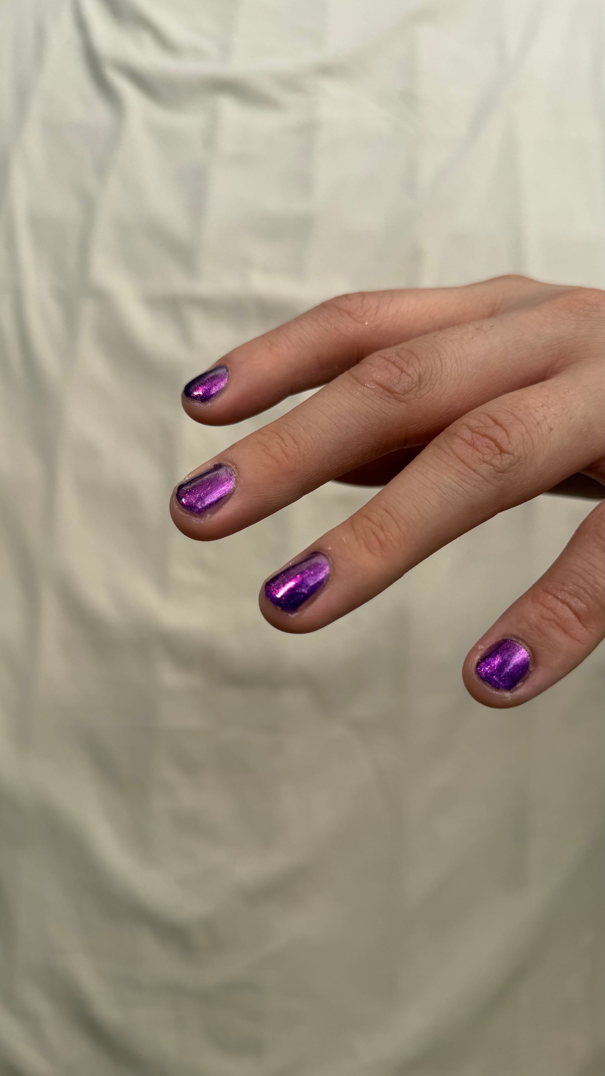 Saturated royal-violet shimmer with glowy fuchsia/raspberry metallic shimmer with a warm gold/green shift at the edges. Feels like a metallic grape soda can: bright and punchy.